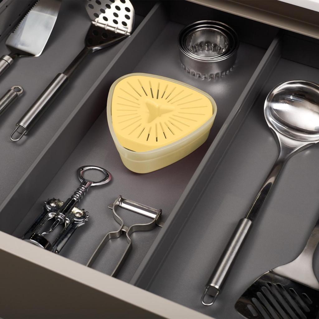 - Its compact design saves space in the kitchen and, thanks to its thoughtful shape, fits comfortably in a drawer among other kitchen utensils.