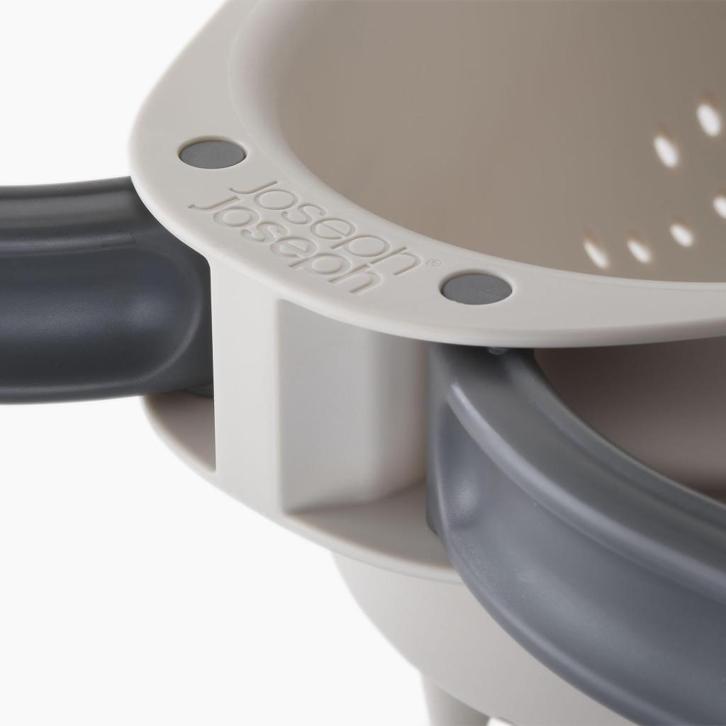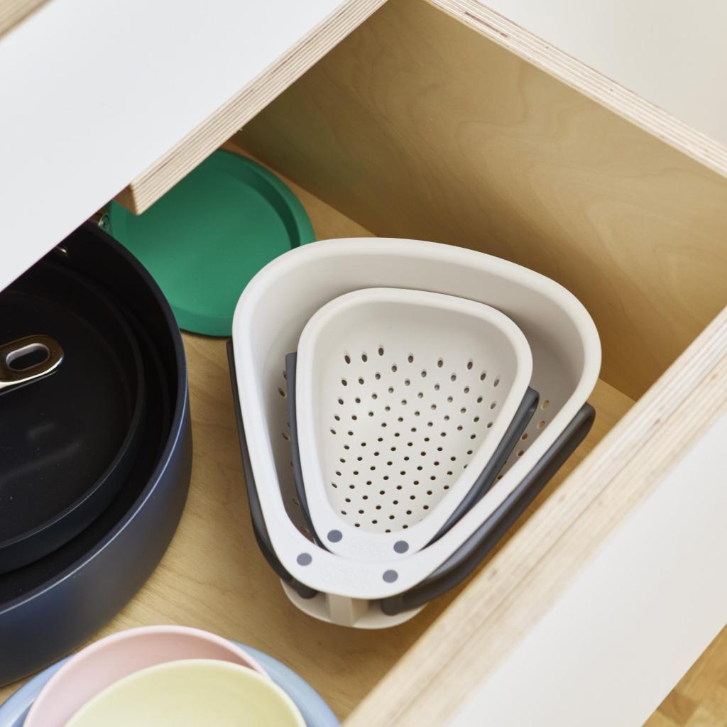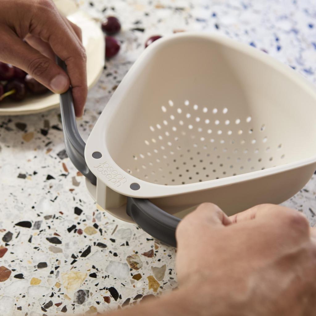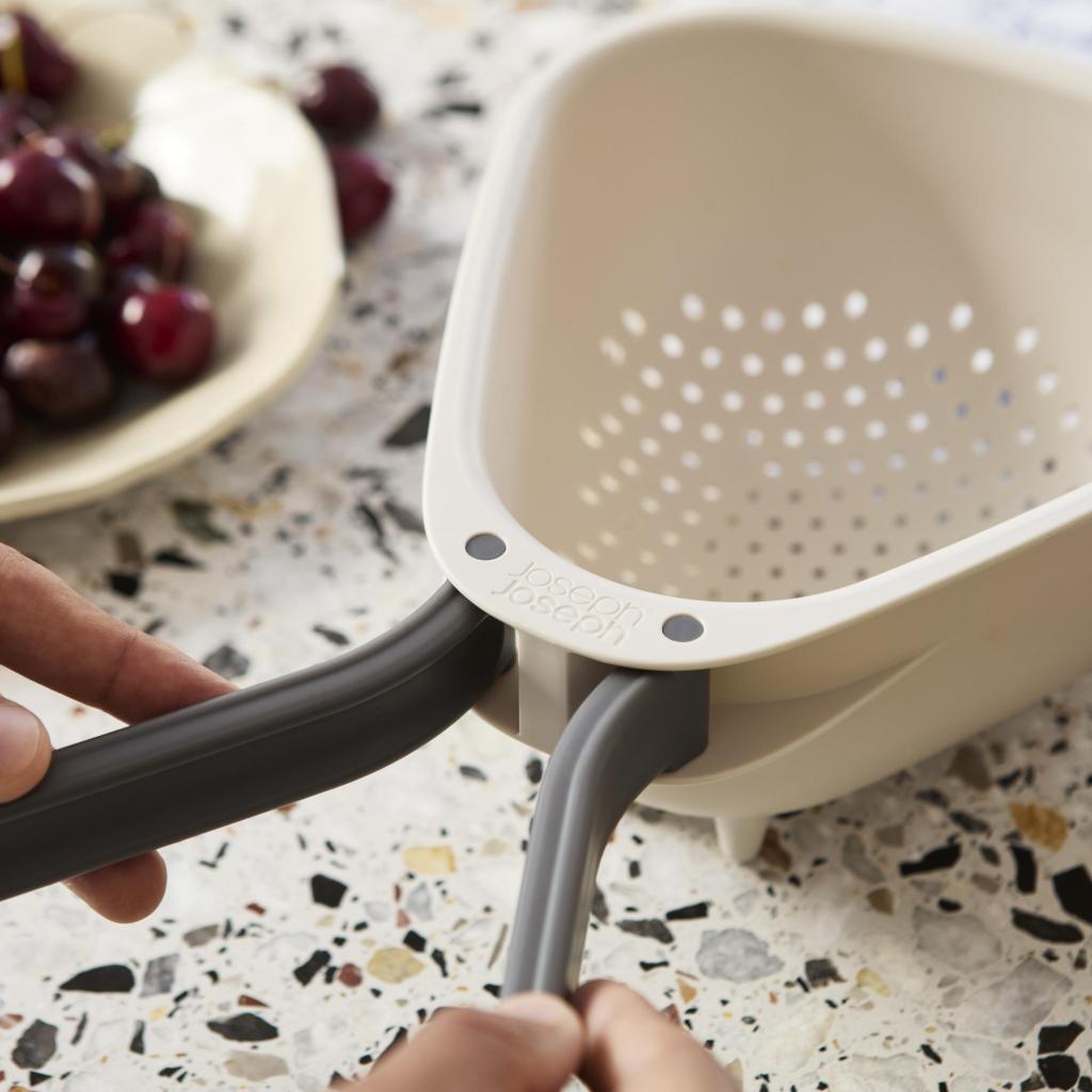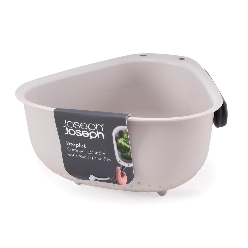 - The large Joseph Joseph DROPLET colander with a practical folding handle is the ideal helper for conveniently rinsing vegetables, draining pasta, and quickly pouring off water directly over the sink.