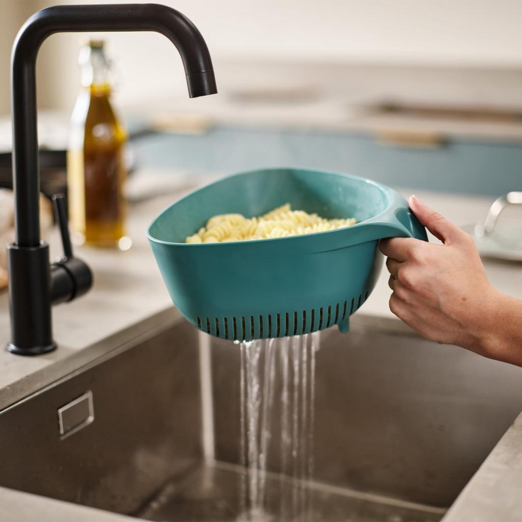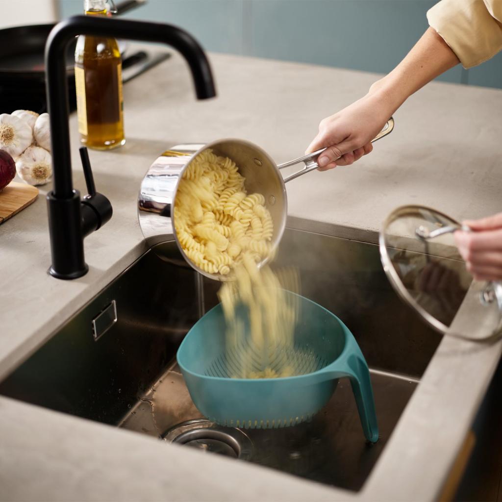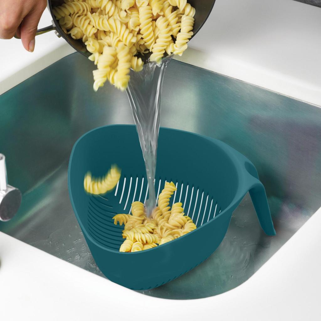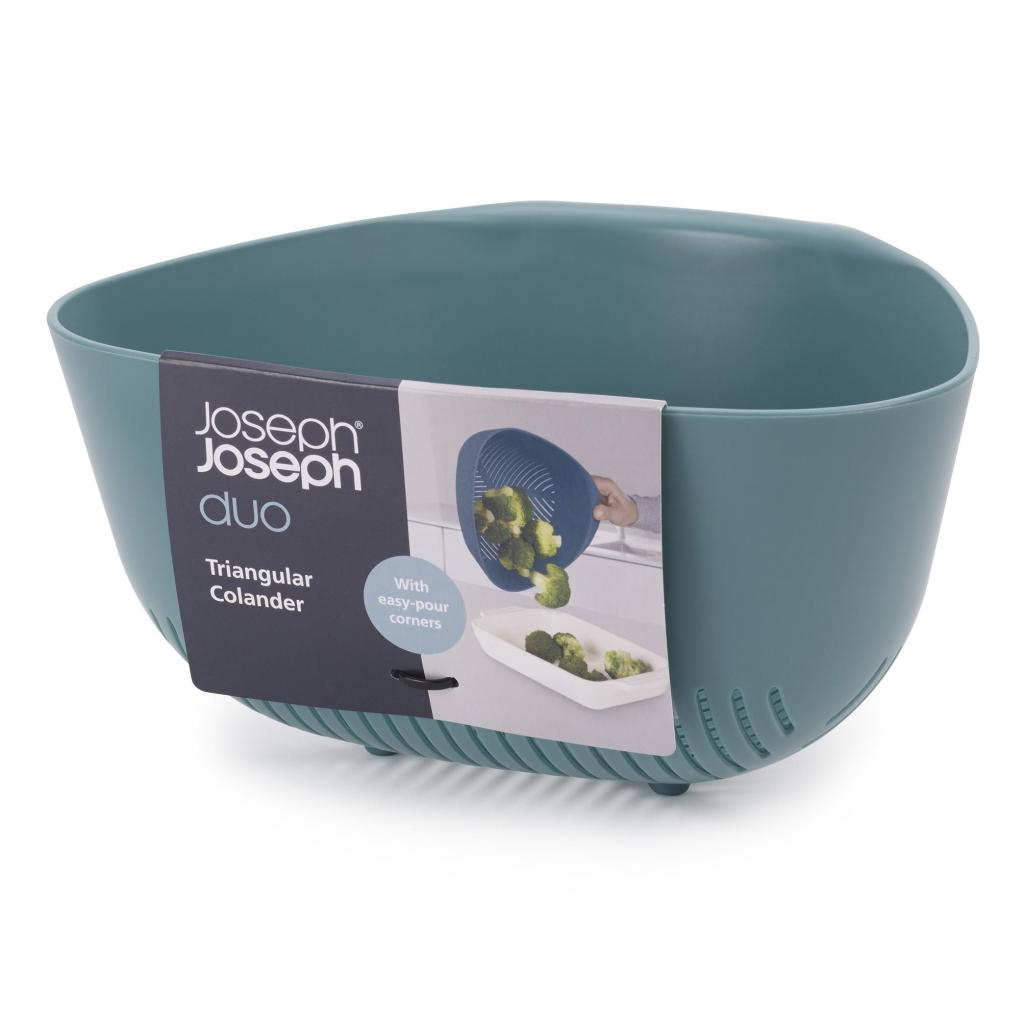 - Colander Joseph Joseph DUO makes it easier to strain pasta, vegetables and fruit thanks to its well-thought-out shape and ergonomic vertical handle.
