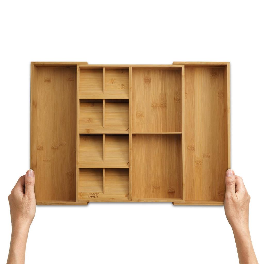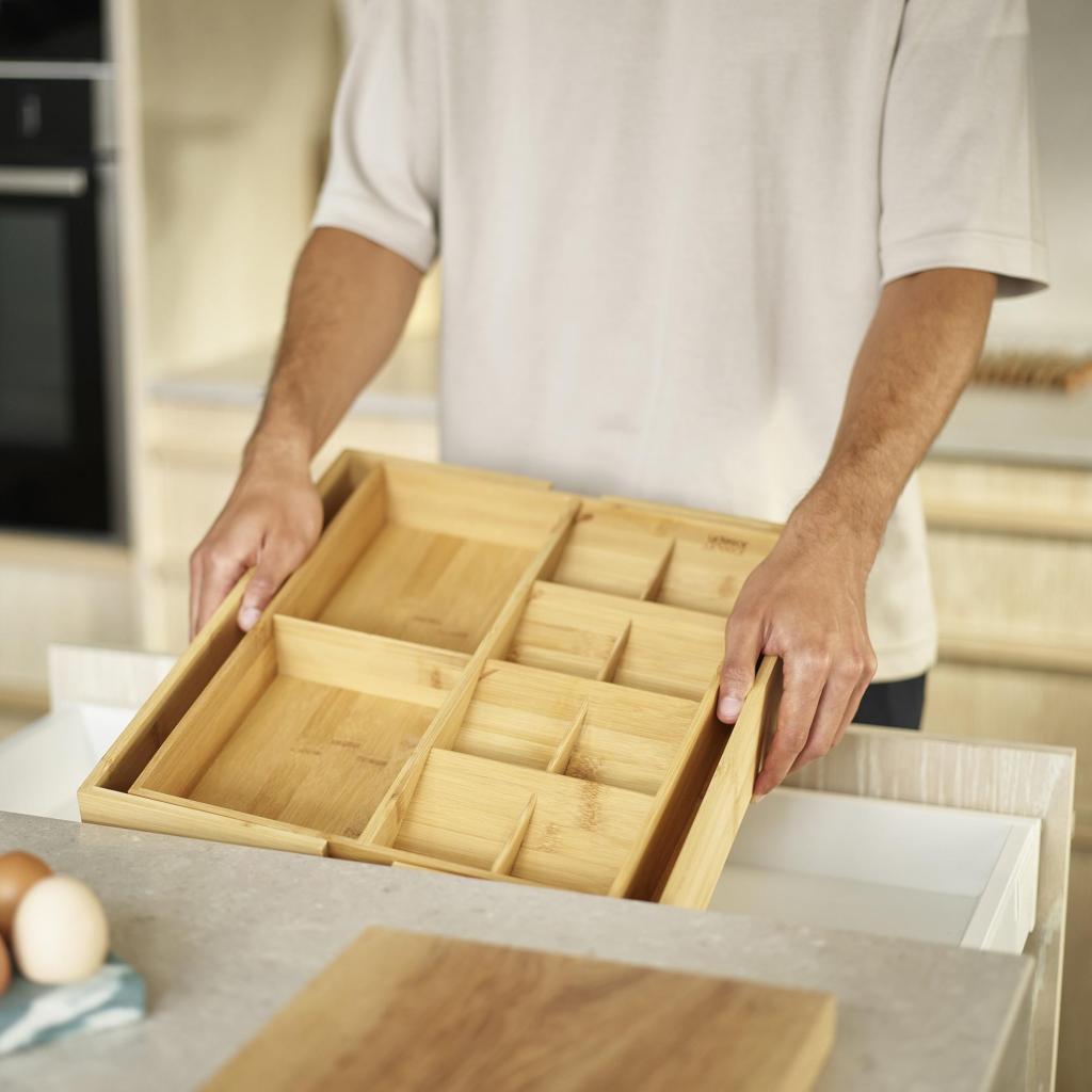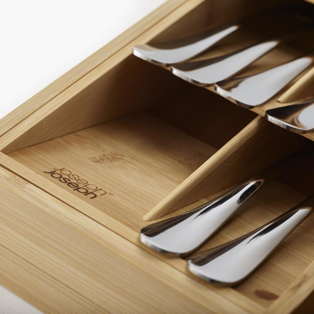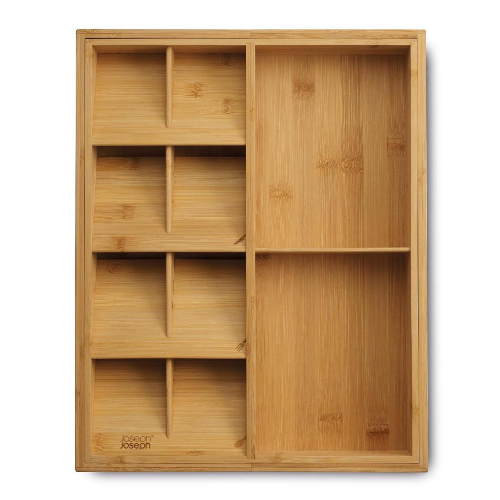 - The Joseph Joseph DRAWERSTORE natural bamboo drawer organizer helps to neatly arrange cutlery, kitchen utensils, and small tools, making everyday kitchen work much more comfortable.