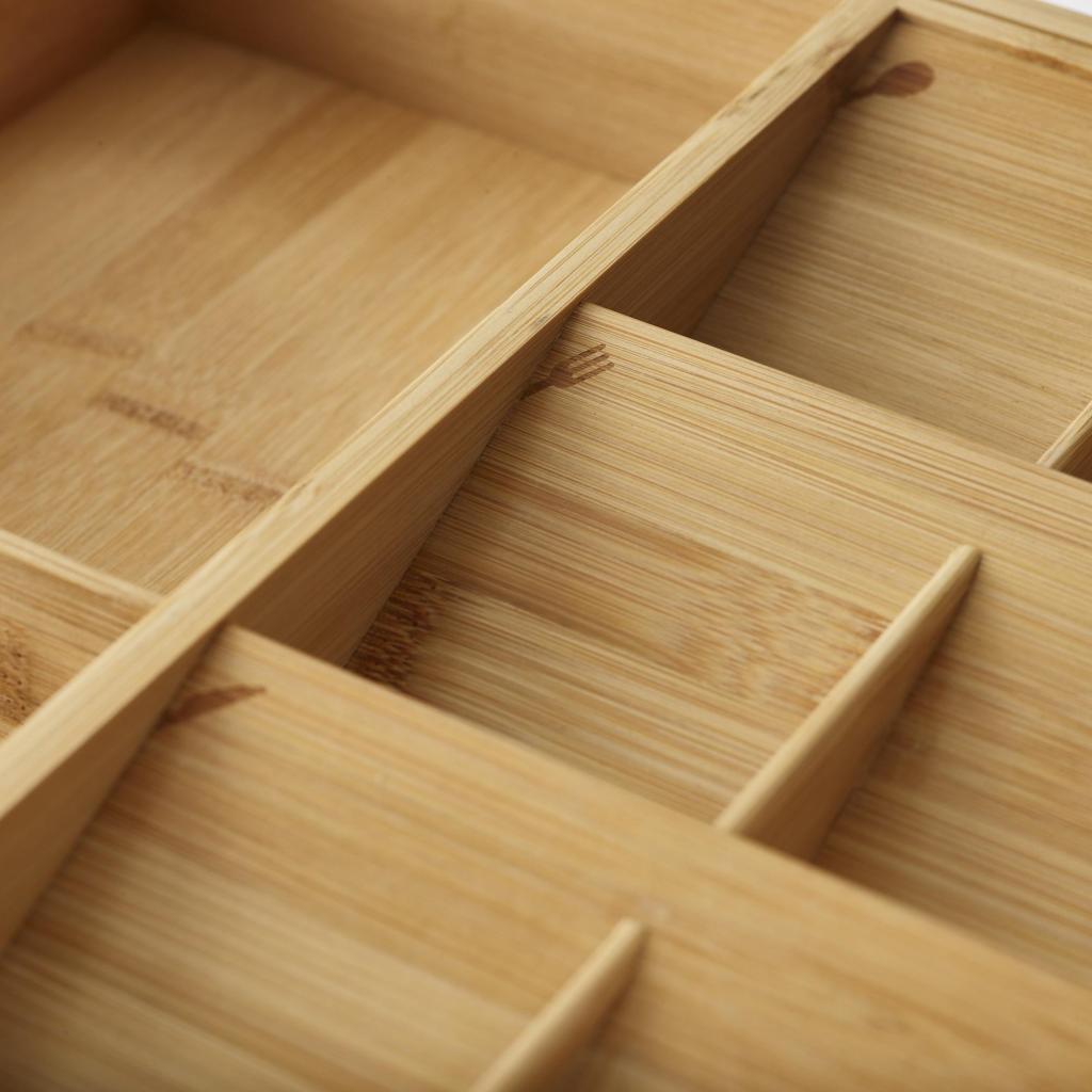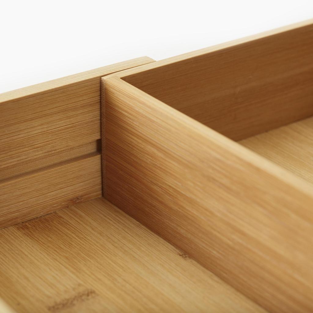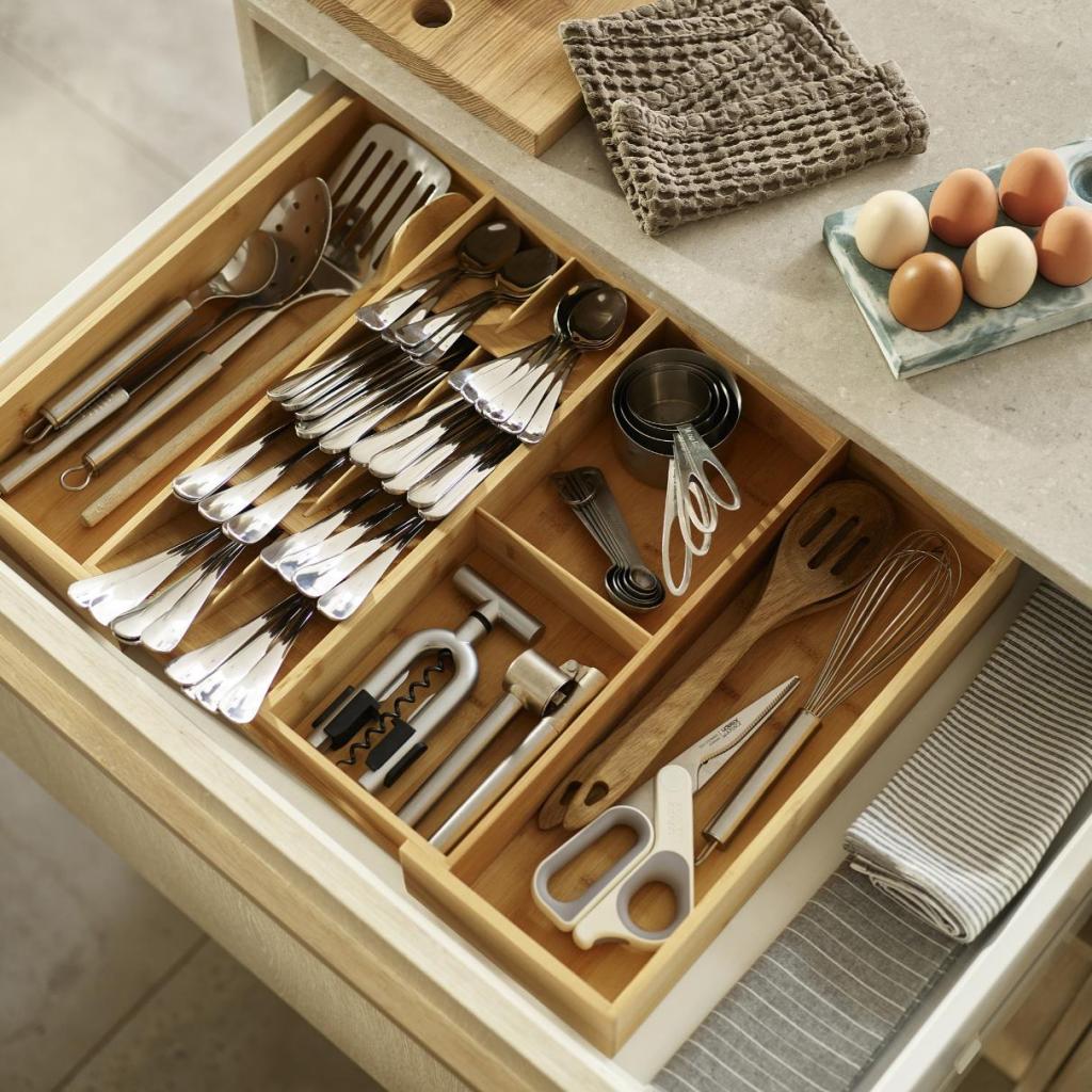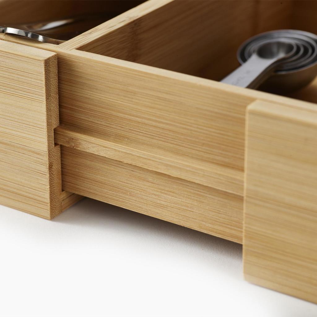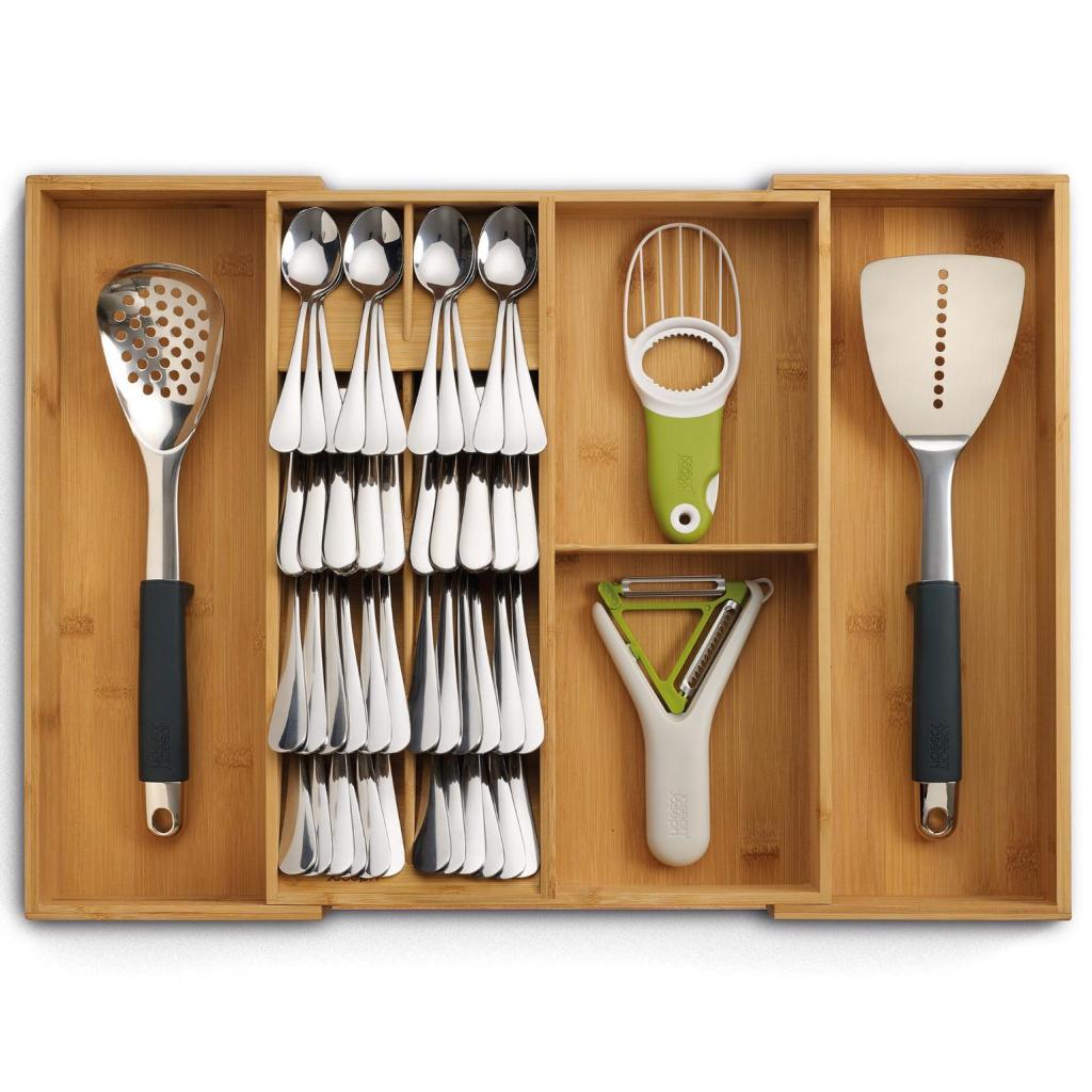 - The Joseph Joseph DRAWERSTORE natural bamboo drawer organizer helps to neatly arrange cutlery, kitchen utensils, and small tools, making everyday kitchen work much more comfortable.