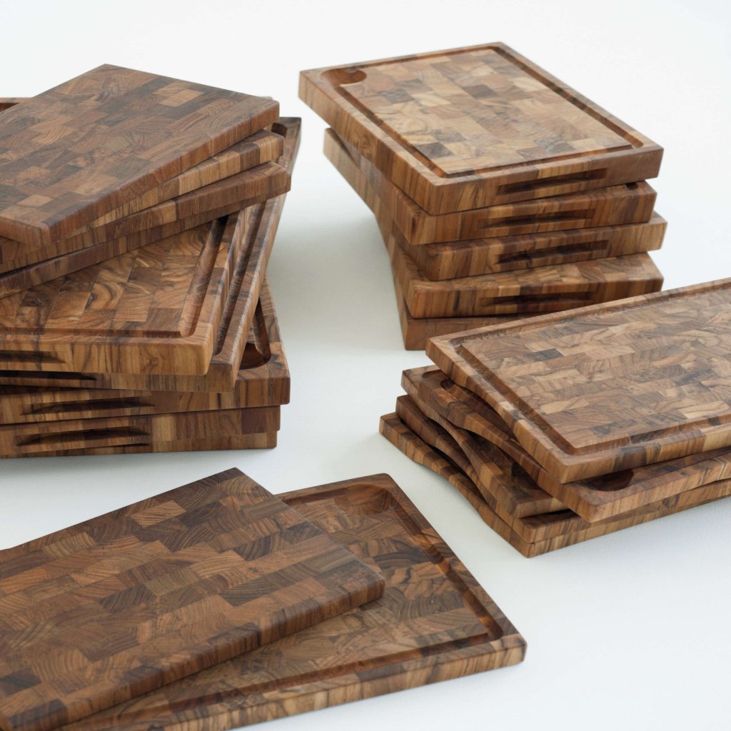 - each board is composed of small pieces of teak end-grain wood, giving it a unique pattern and distinctive colour texture