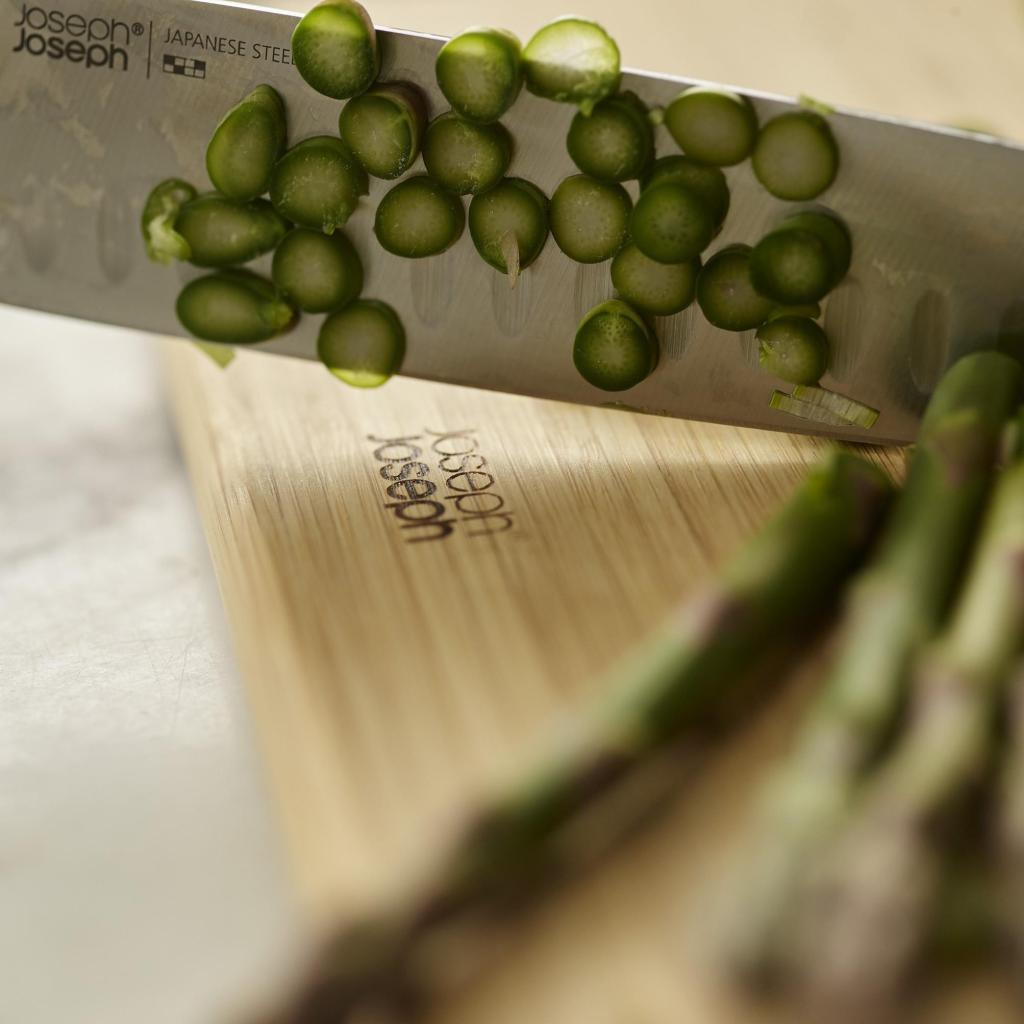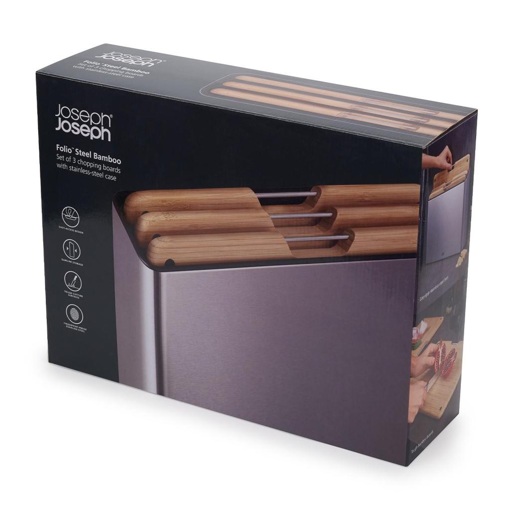 - The Joseph Joseph FOLIO set of 3 bamboo cutting boards offers a practical solution for preparing various ingredients while keeping your countertop neatly organized thanks to its elegant stand.