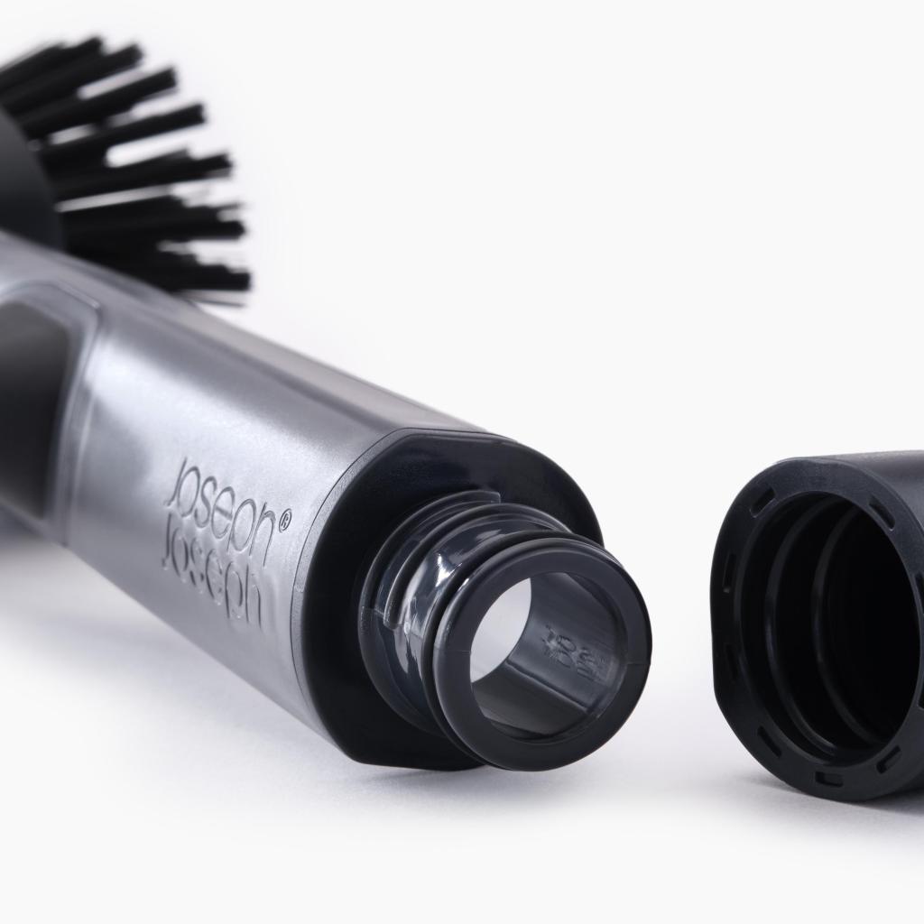 - Simply press the top button and the precise amount of detergent will be released directly into the bristles for immediate and effective removal of dirt.