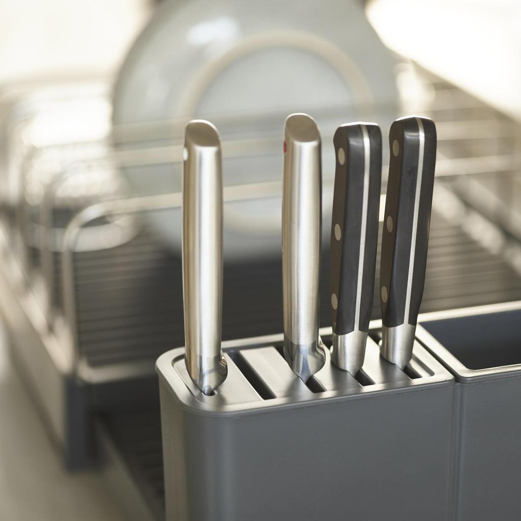 - The removable cutlery drainer can be positioned as needed and also includes slots for safely storing knives.