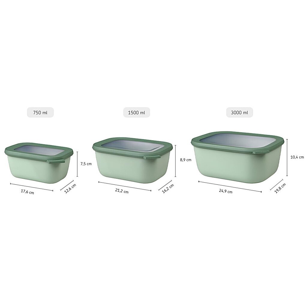 - practical 750 ml, 1500 ml and 3000 ml sizes allow you to store pasta, salads, pastries or portions of main meals
