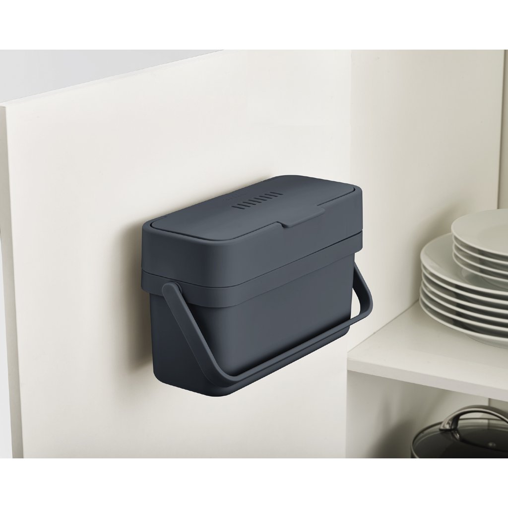 The JOSEPH JOSEPH Compo container has been designed as a practical basket for leftovers. Thanks to its narrow shape, it does not take up space on the worktop. It comes with brackets for installation on the inside of the door. The lid of the container can be opened wide so that leftovers can be easily scooped from the plates directly into the container. The lid has lockable ventilation holes. In the open position, they allow moisture to escape and thus reduce possible odours. In summer, the air vent cap prevents insects from entering the container. The capacity of the container is 4 litres. In the case of composting, it is advisable to use biodegradable bags.