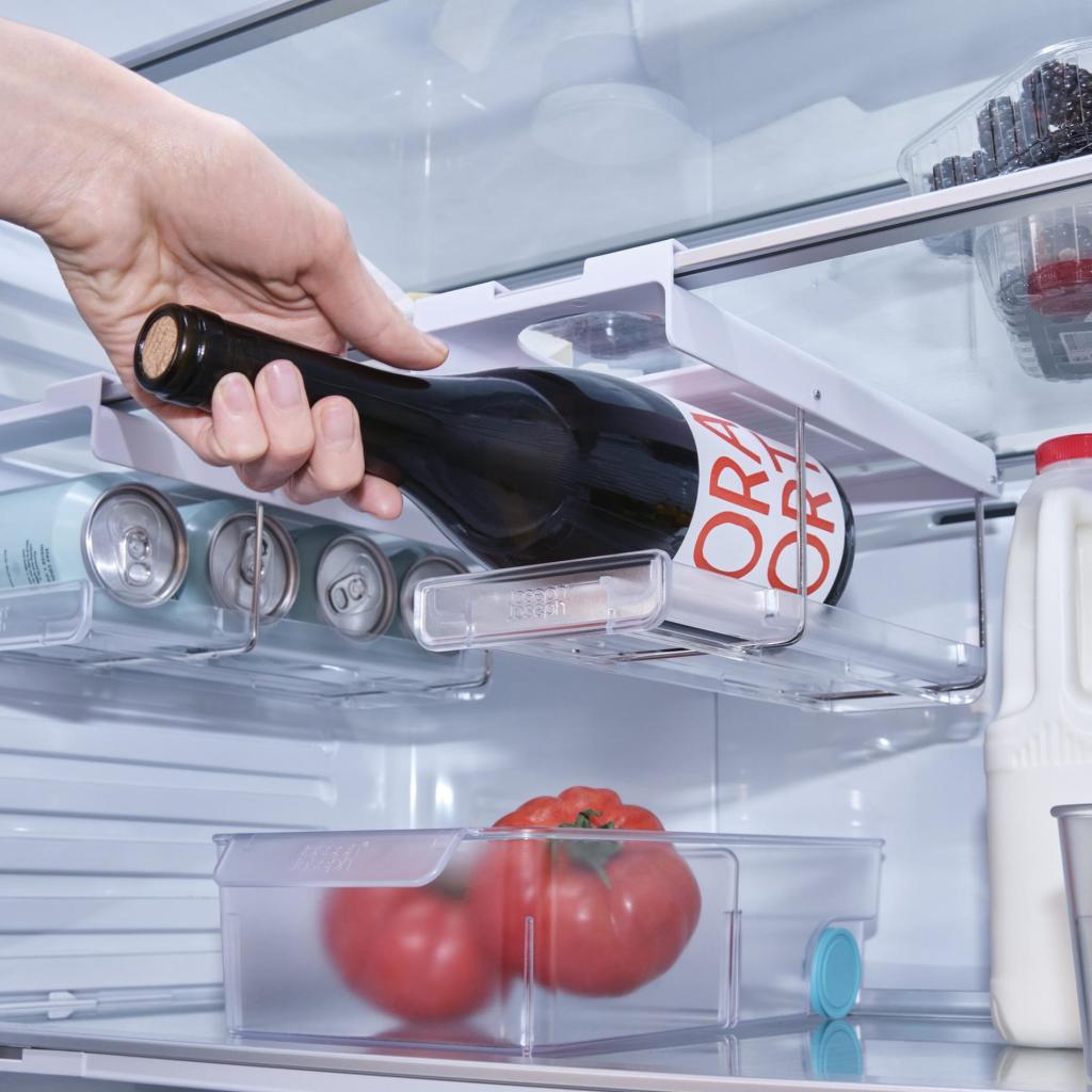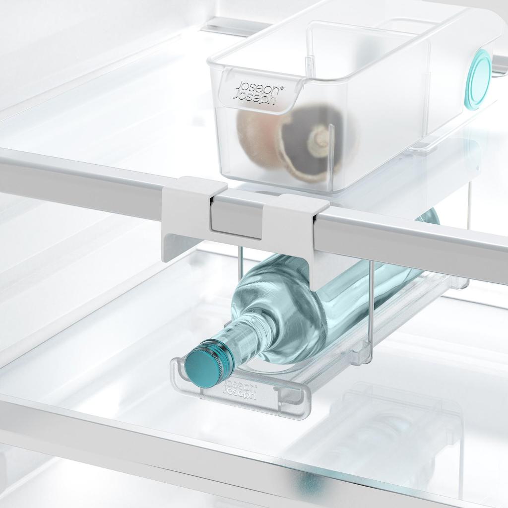 - The Joseph Joseph FRIDGESTORE folding bottle holder for the refrigerator is a smart solution for securely and neatly storing wine or champagne without unnecessary space consumption.