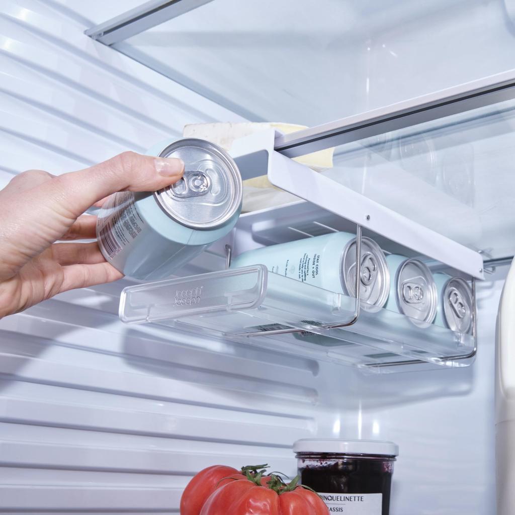 - The Joseph Joseph FRIDGESTORE under-shelf can holder is a practical solution for clear and space-saving storage of beverages directly in your refrigerator.