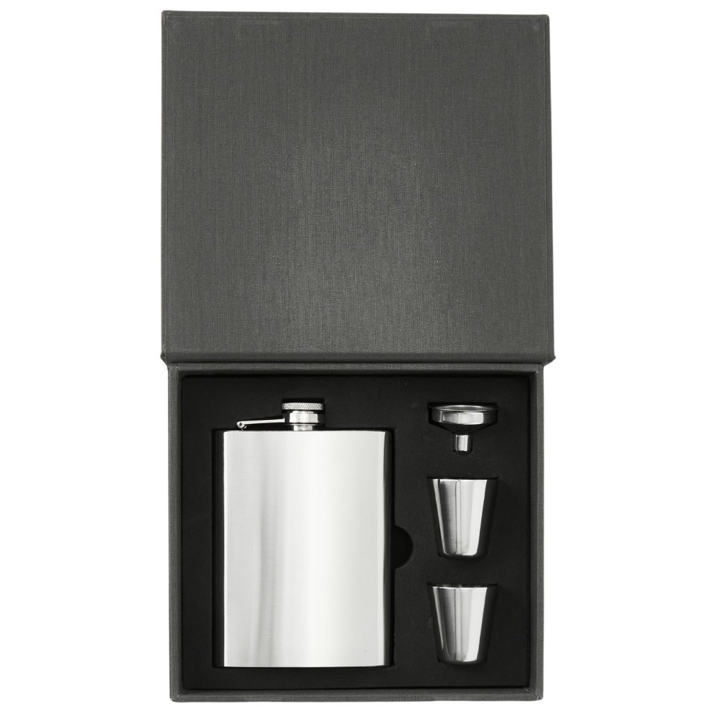 - set includes a flask, two cups and a funnel for easy filling