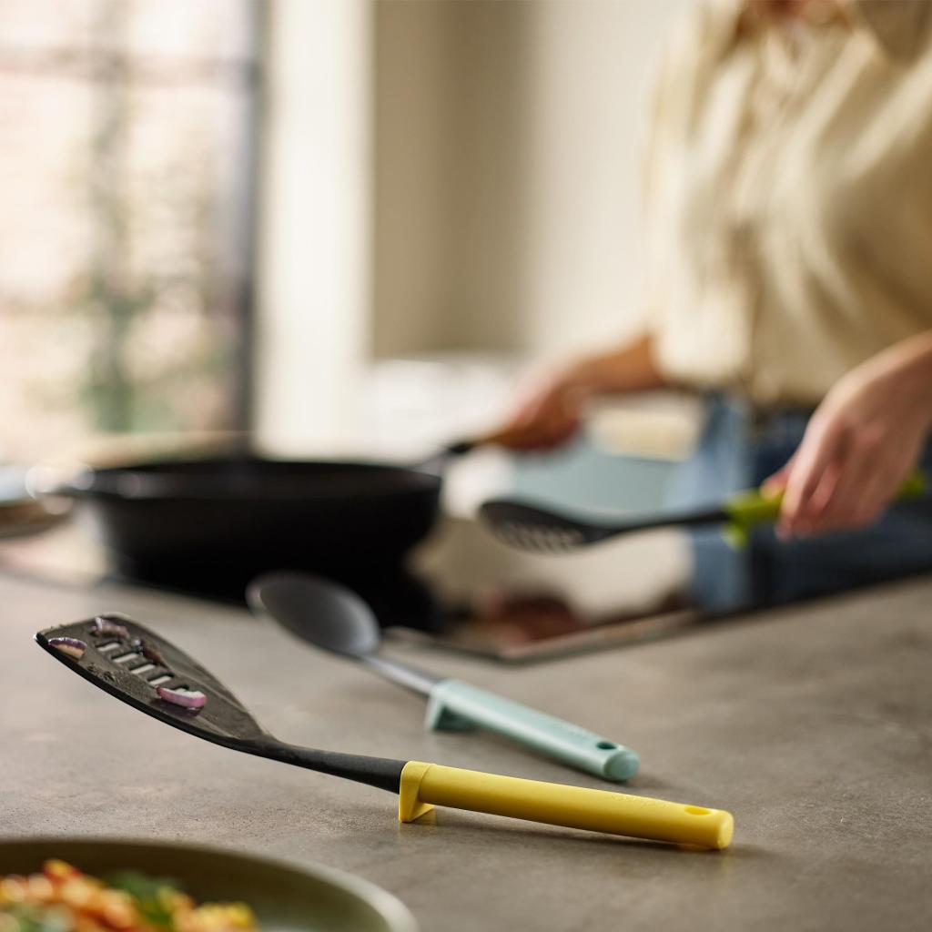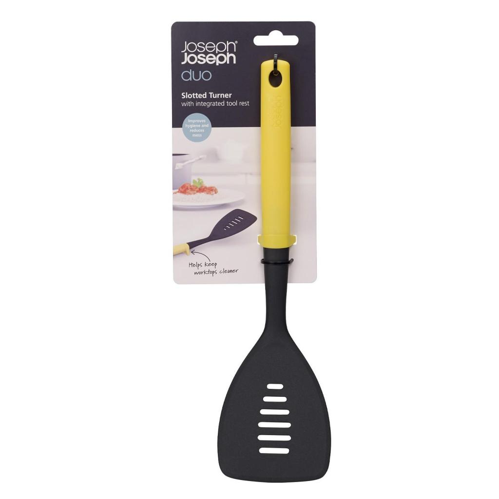 - The perforated kitchen turner Joseph Joseph DUO in yellow is a practical helper for everyday cooking, frying, and convenient serving of finished dishes directly from the pan.
