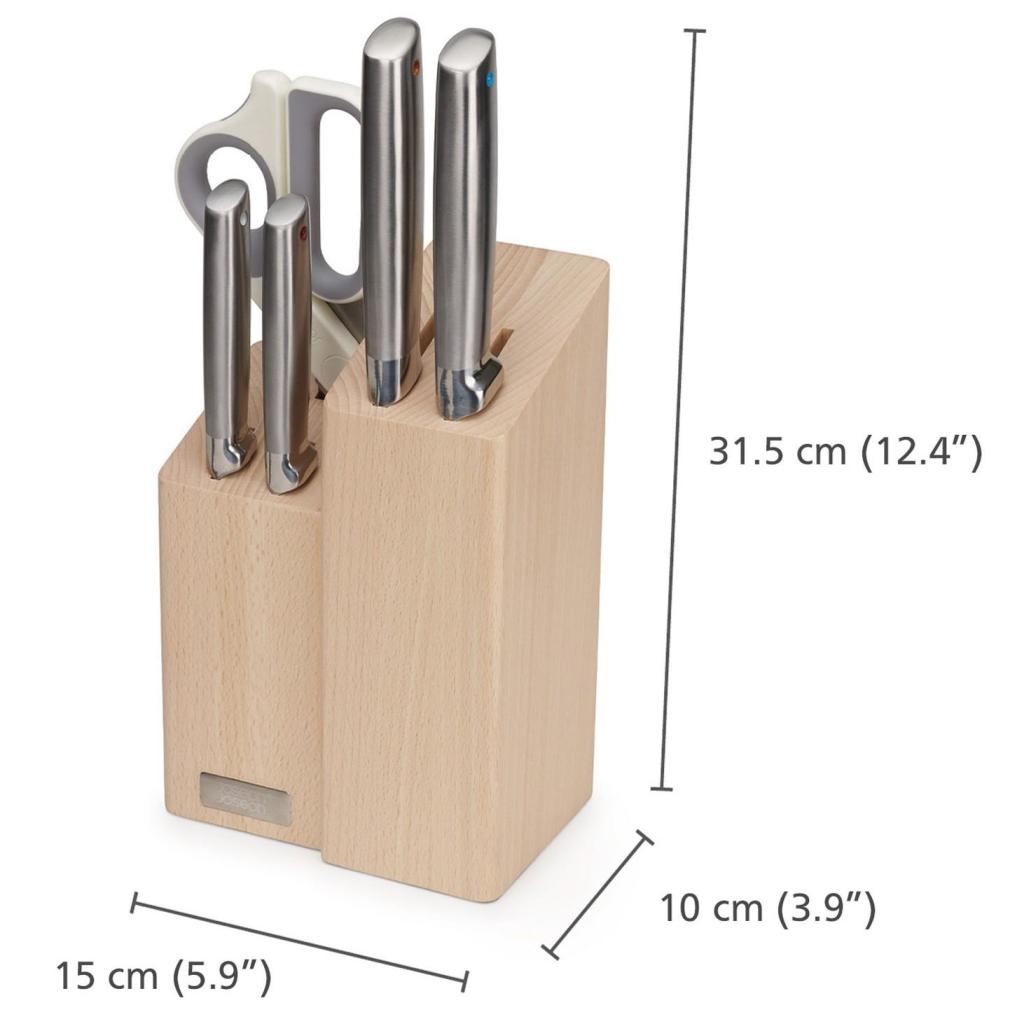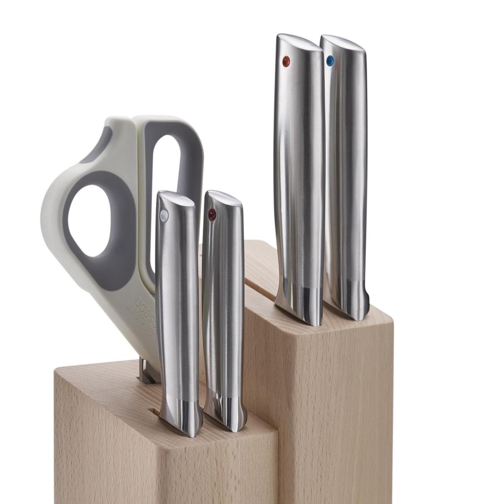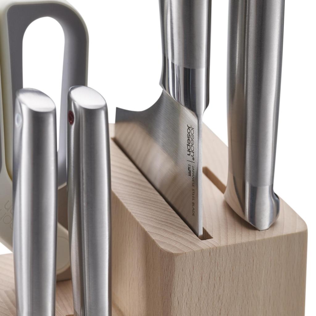 - The ELEVATE FUSION set of kitchen knives and scissors from Joseph Joseph offers a practical solution for everyday ingredient preparation and organized storage of utensils in an elegant beech wood block.
