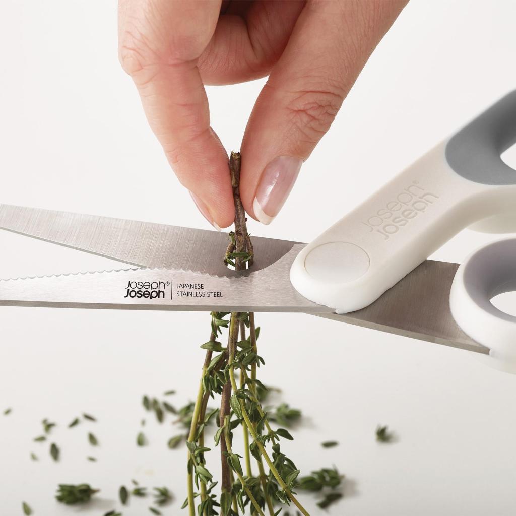 - The integrated herb stripper on the kitchen scissors allows for quick separation of herb leaves from stems during the preparation of fresh ingredients.