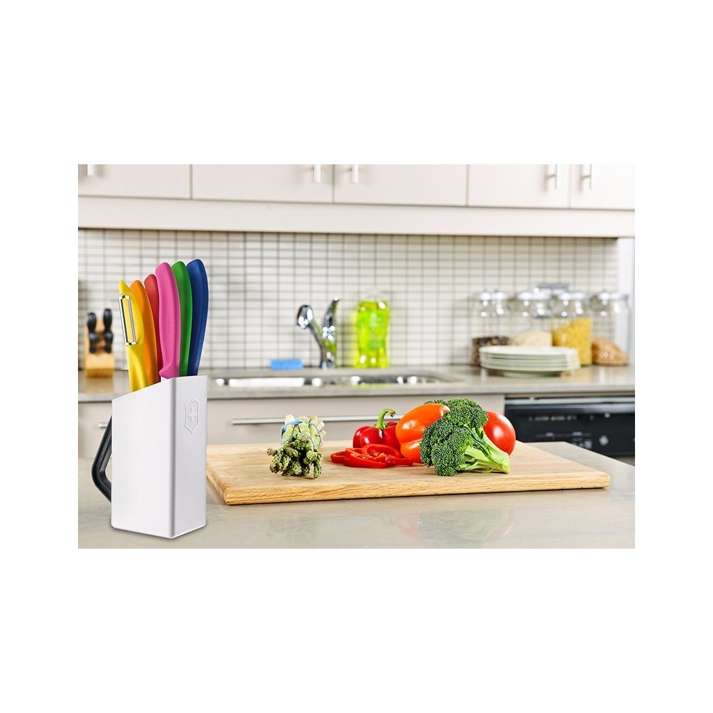 The knife set contains 5 basic knives for everyday work in the kitchen, for activities requiring precision. Each knife can be used for a different function - for slicing vegetables, cutting meat, a knife with a serrated or straight blade, etc., or a vegetable and fruit peeler. The knives are made in Swiss quality and come in a colourful design.
