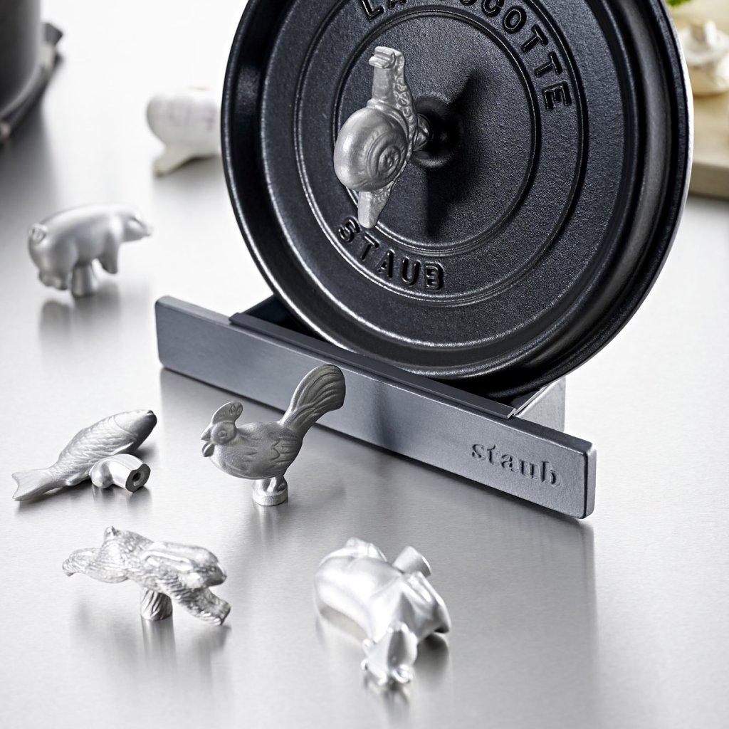 The rabbit-shaped lid handle from the French brand Staub fits Staub pot lids with a diameter of 18 to 41 cm. It allows you to easily identify which pot the rabbit meat was cooked in. Or simply and simply serve as a decoration for your Staub dishes.