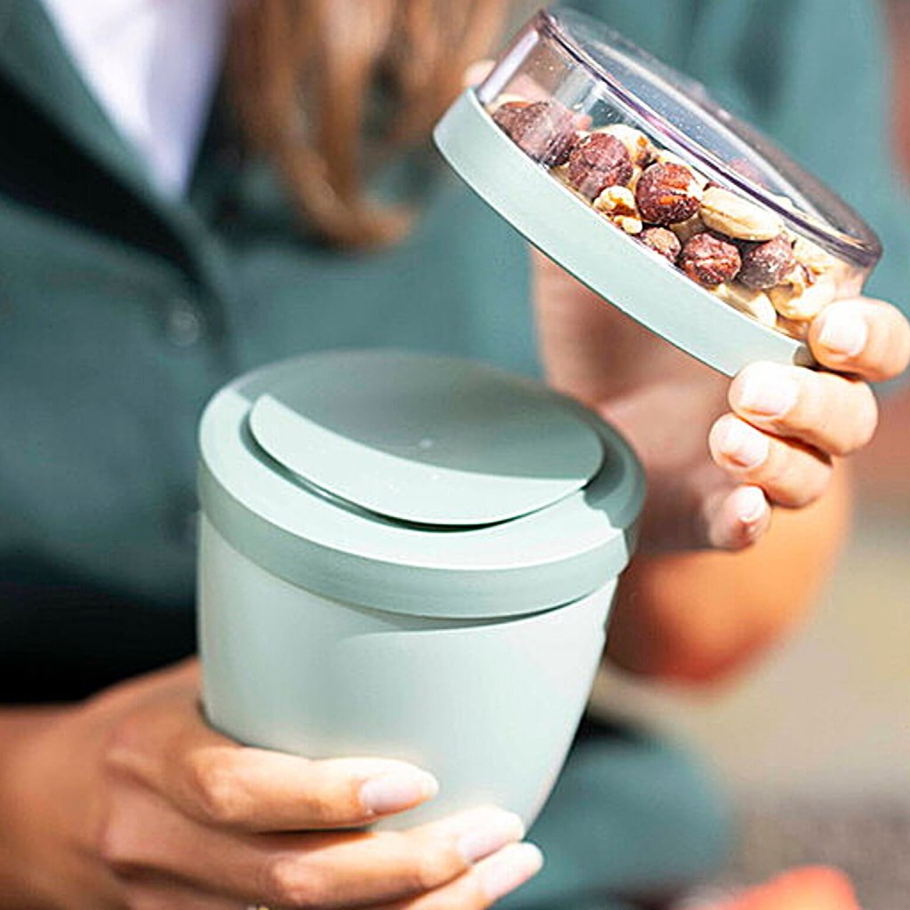 - the top transparent 120 ml container can hold approximately 50 grams of muesli, fruit or crispy toppings
