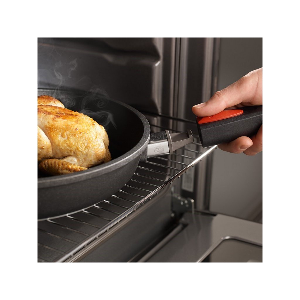 The patented mechanism of the removable heat-insulated handle ensures comfortable use of the cookware. The supporting part of the handles or handles is cast into the casting of the pan. They form a single unit which ensures a secure fit. The great advantage of Titanium Nowo cookware is its perfect heat distribution and accumulation. The pans can be used on all types of heat, including induction, and after removing the handle also for baking in the oven, up to 250 °C.