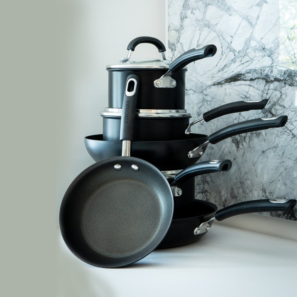 - hard-anodized aluminum construction provides excellent durability and ensures even heat distribution, eliminating hot spots and preventing food from burning
