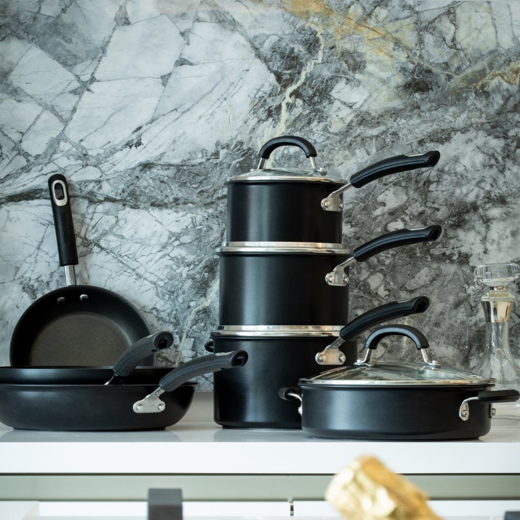 - hard-anodized aluminum construction provides excellent durability and ensures even heat distribution, eliminating hot spots and preventing food from burning