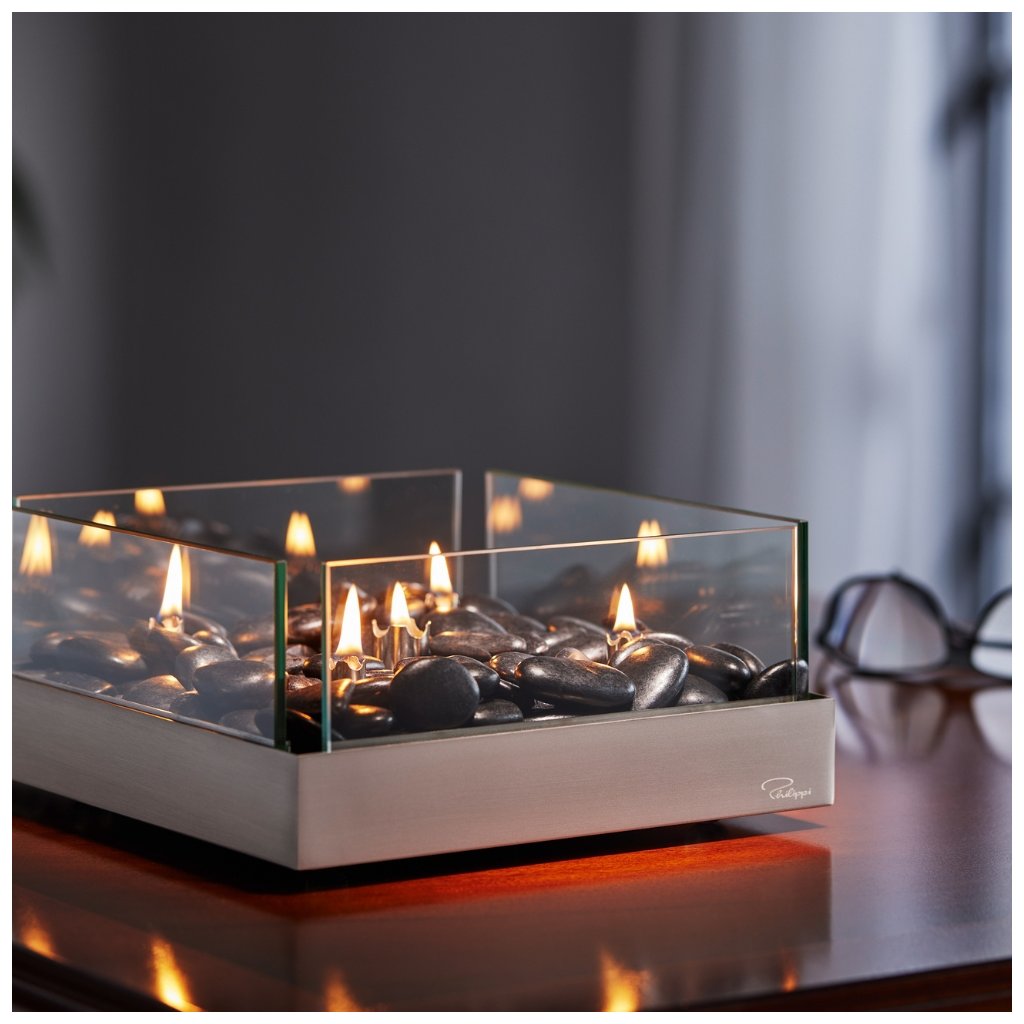 - materials: glass, steel, glass fibre wicks, river stones