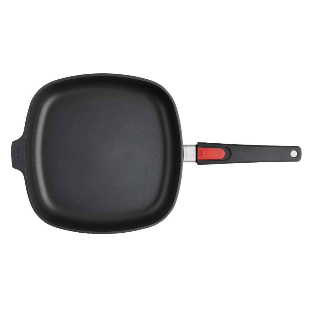 - It includes a classic square pan and a square grill pan pan with a glass lid, both measuring 28 × 28 cm and with a removable handle for maximum flexibility.