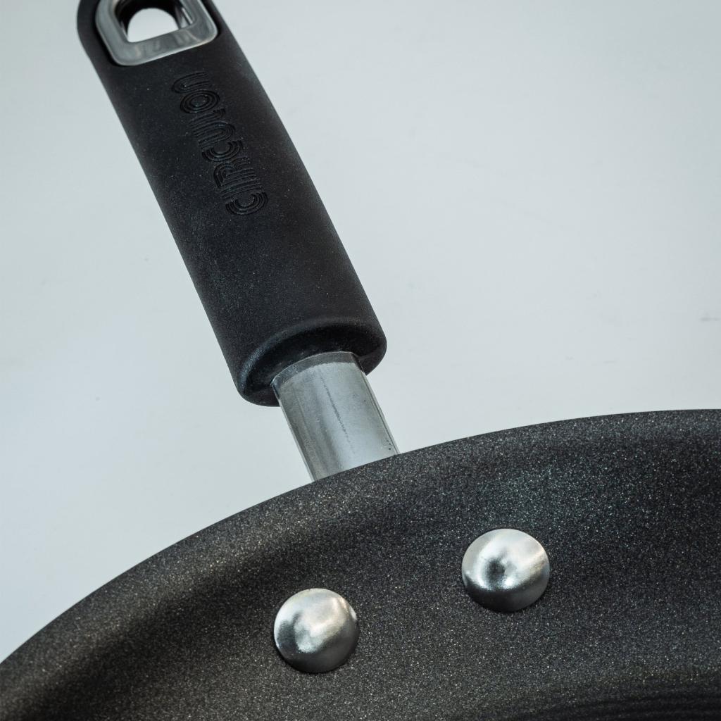 - hard-anodized aluminum construction provides excellent durability and ensures even heat distribution, eliminating hot spots and preventing food from burning