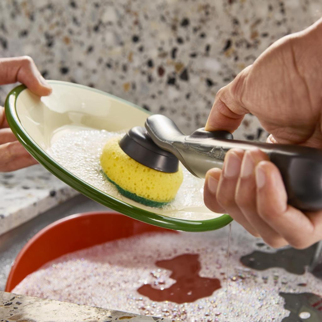 - The cleaning surface is designed to be gentle on surfaces and not scratch more delicate dishes.