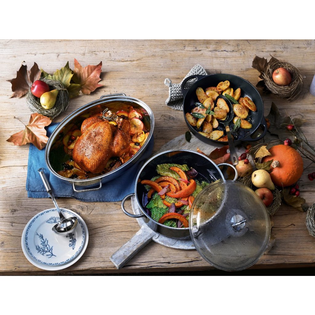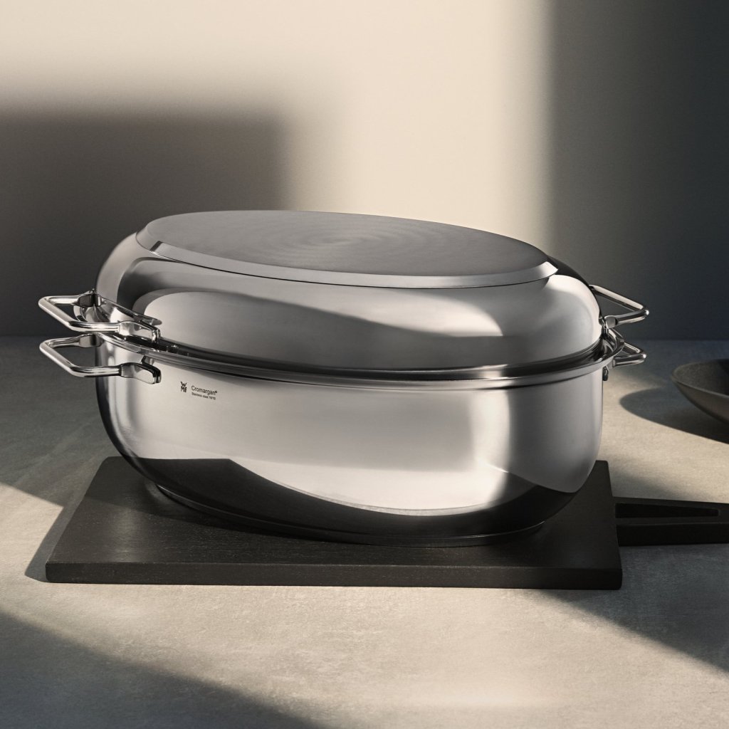 Oval baking pan with stainless steel lid with dual use from the traditional German manufacturer WMF is ideal for cooking, frying, roasting and stewing meat, fish and vegetables. In the large roasting pan, you can easily prepare a delicious roast beef for the whole family or a whole large roast goose with a golden crust. The surface will be perfectly crispy, while the meat inside will remain tender and juicy. The baking dish is perfect for use in the oven. The multifunctional lid, which can be used as a frying pan, will be appreciated when cooking on the stove. Like the baking pan, the lid is fitted with a Trans Therm®universal base .