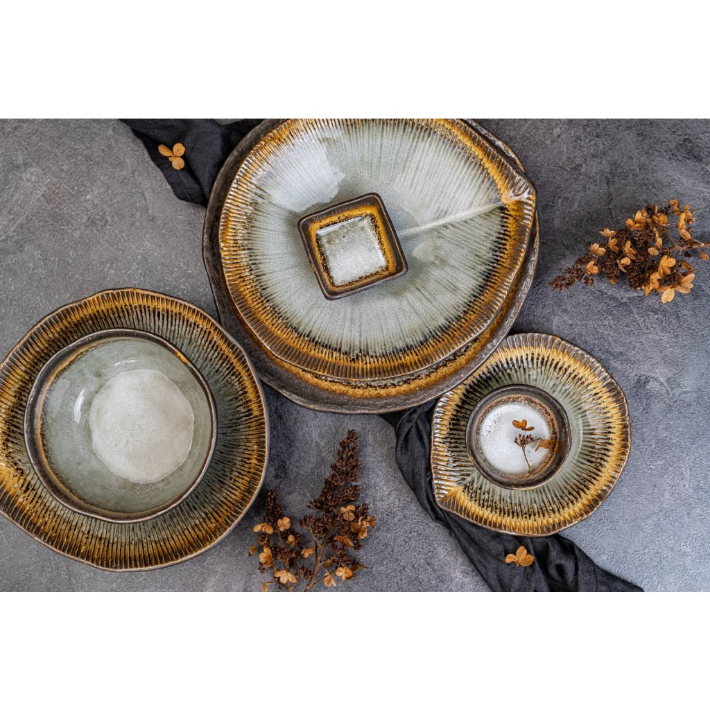 In this package you will find a very interesting sauce dish with an irregular rim from the Akane Grey collection, with a diameter of 8 cm. The glossy bowl has grey colour, yellow lines and brown edges.