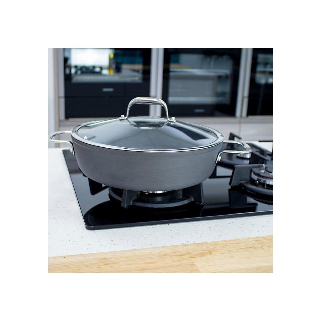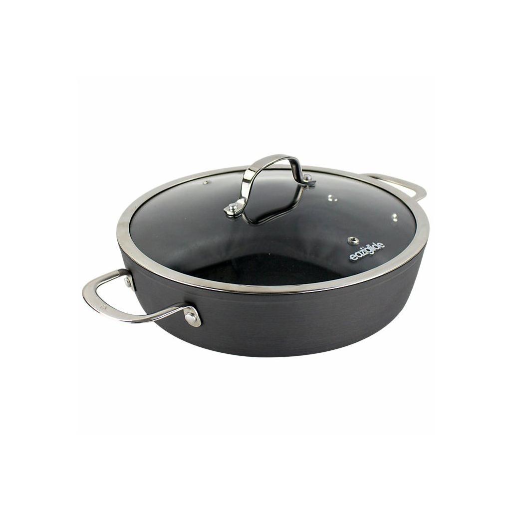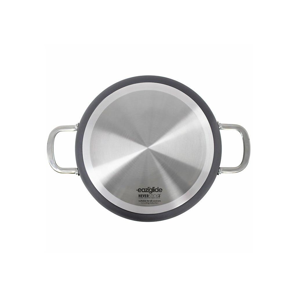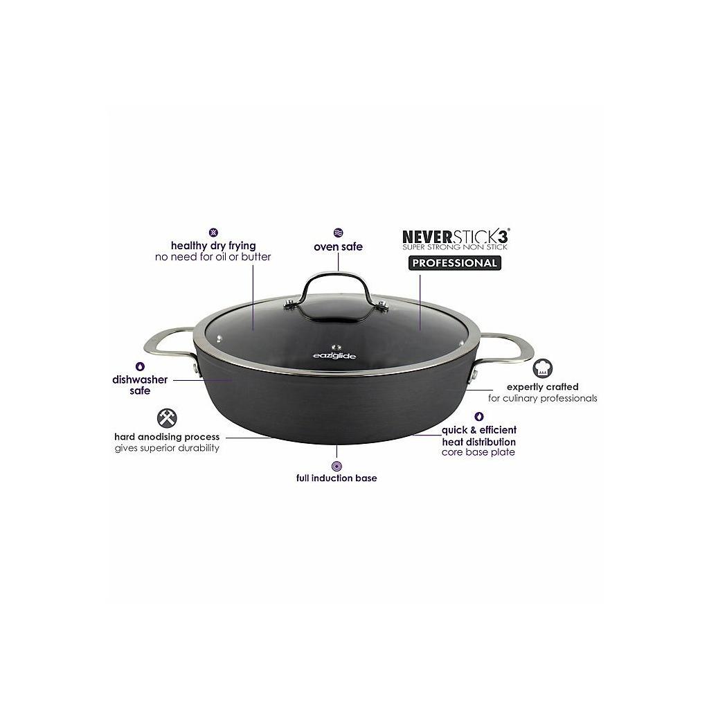 The Eaziglide Neverstick3 Professional cookware collection includes the best of the line. It is made of anodized aircraft aluminum for intense durability. The latest and improved non-stick cookware surface lasts much longer than other surfaces. It is ideal for culinary professionals. This top-quality cookware is ideal for all types of cookers, including induction, and can also be used for baking in the oven up to 260 °C and dishwasher safe. Cooking becomes healthier with this cookware because you can cook without oil or other fats.