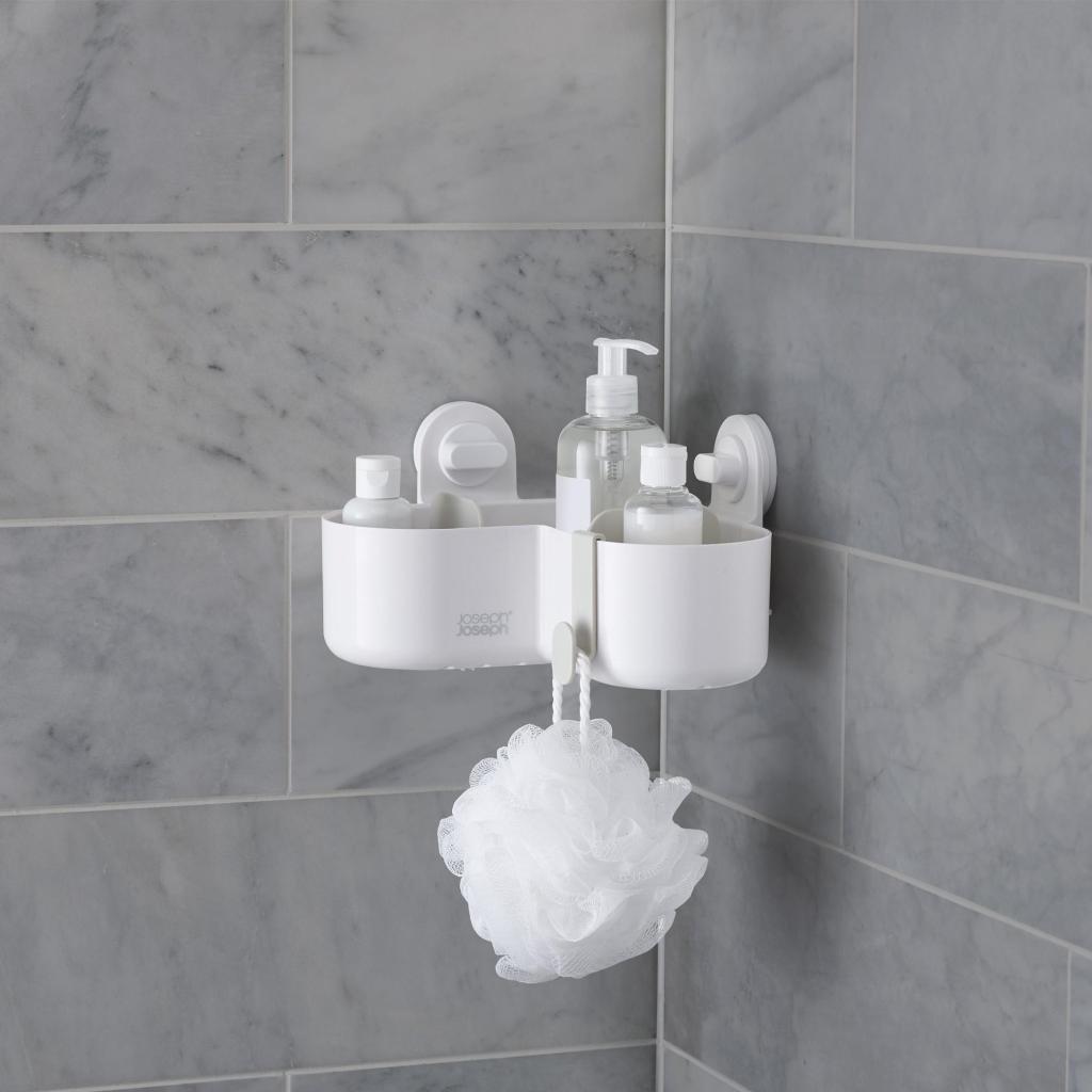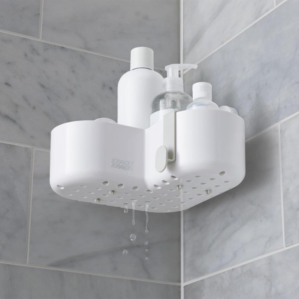 - The Joseph Joseph DUO corner shower shelf provides a practical and clear solution for storing soap, shampoo, and shower gel directly in the shower cubicle space.