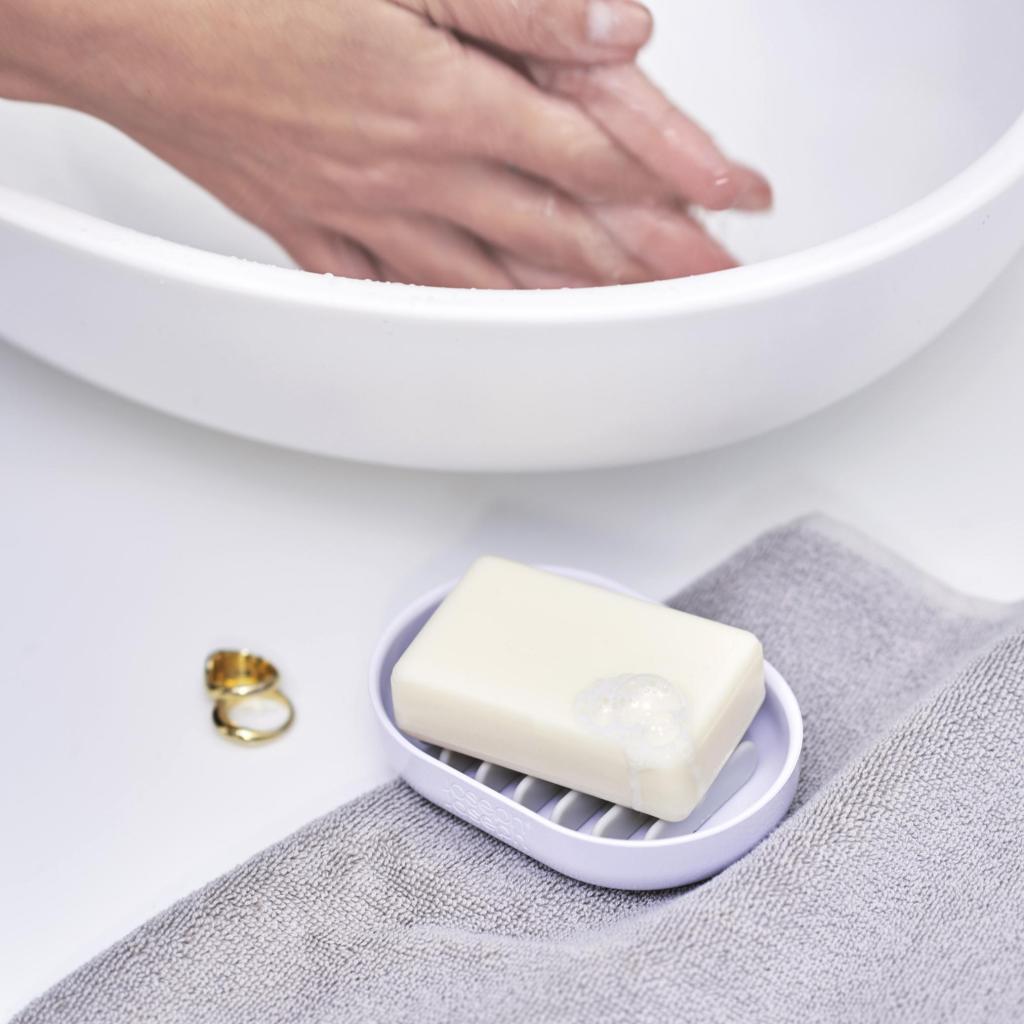 - The internal draining rack holds the soap in an elevated position above the dish base, allowing excess water to drain after each use.