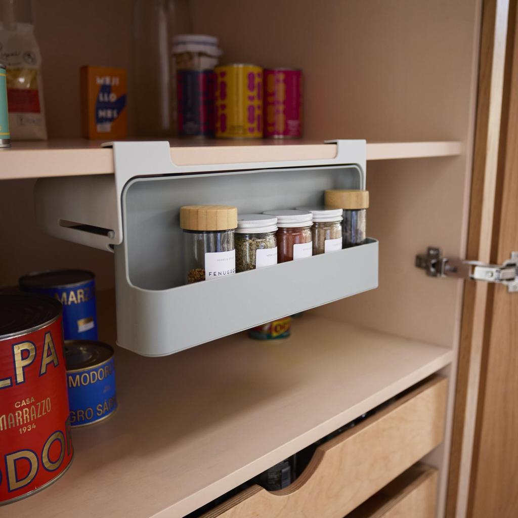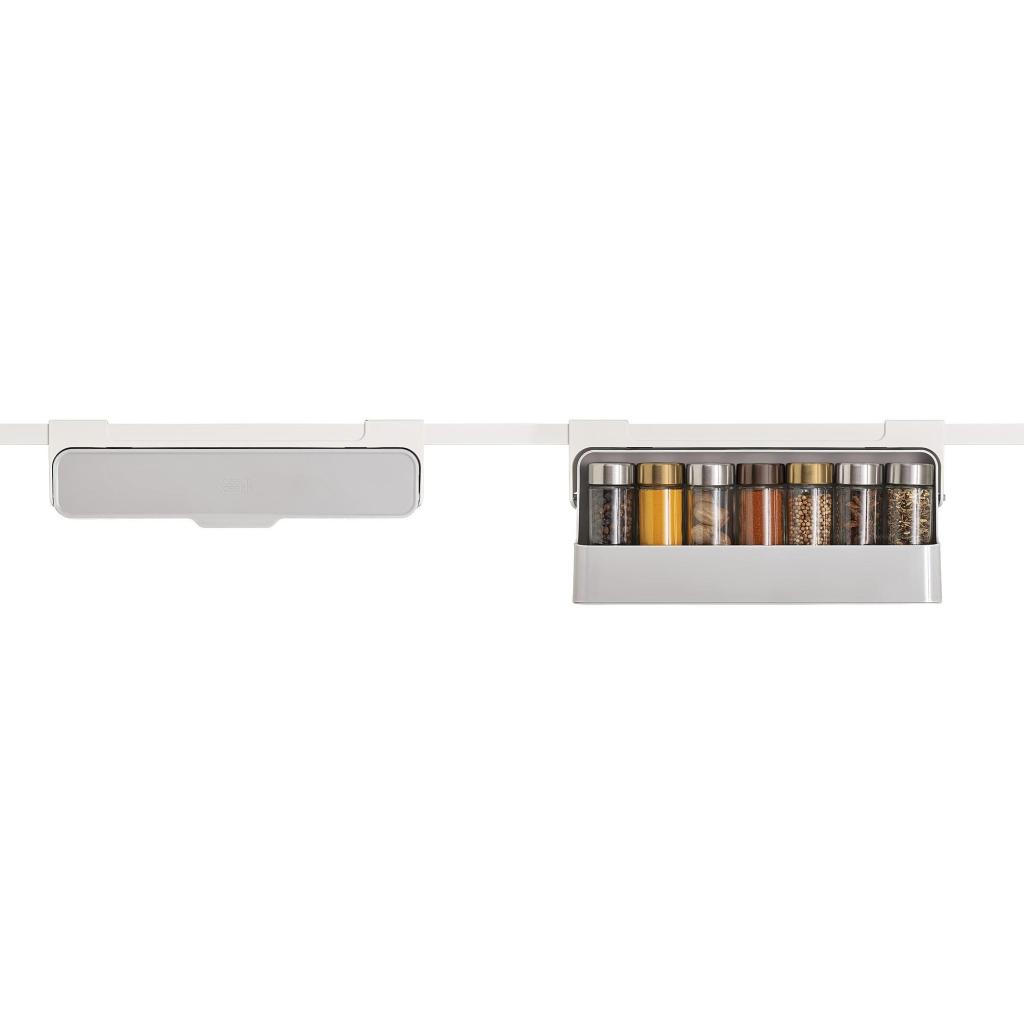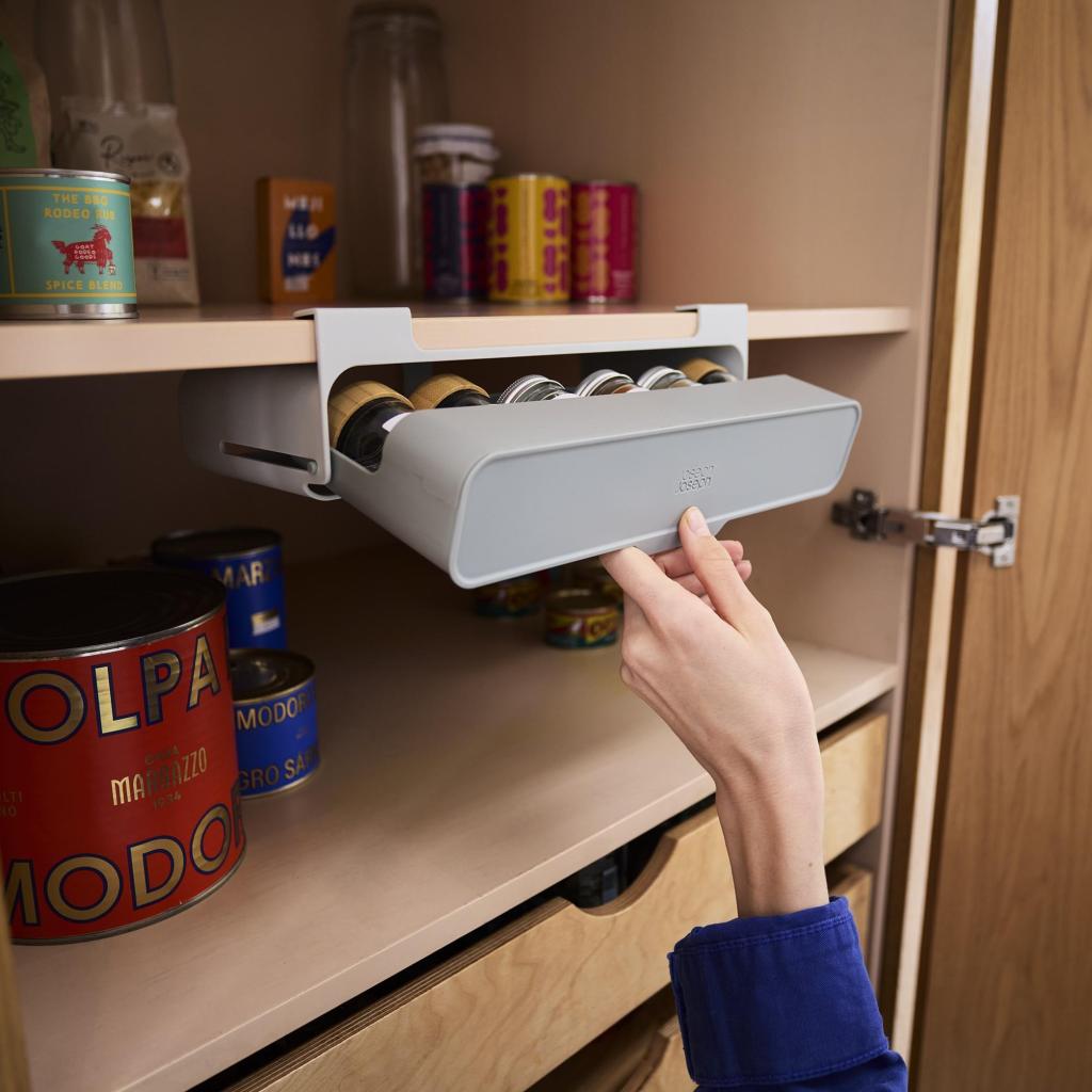 - The practical Joseph Joseph CUPBOARDSTORE spice containers holder helps utilize the space under the cabinet shelf, which often remains unused, and transforms it into an organized place for storing spices.
