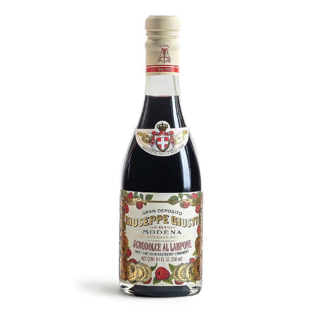 - giusti flavored vinegar is a sweet and sour raspberry condiment with an intense color and a distinctly fruity taste