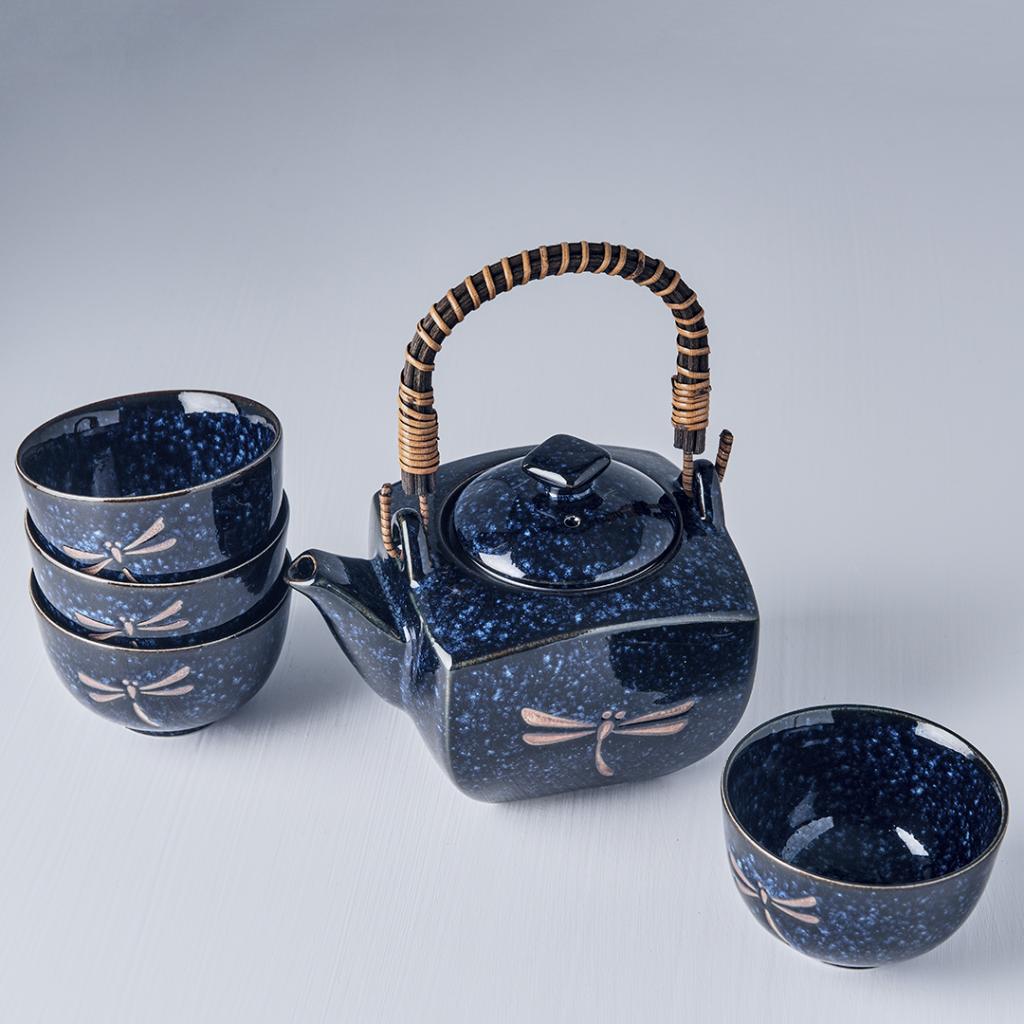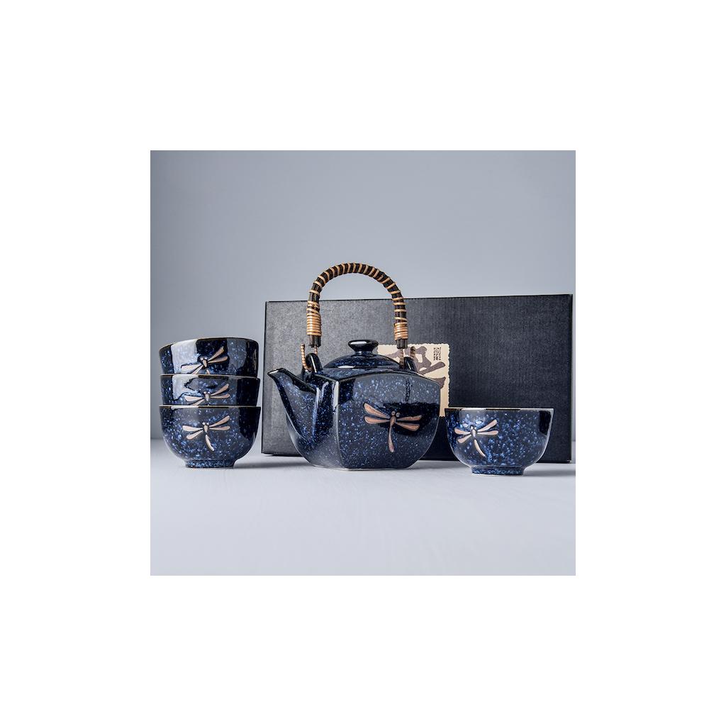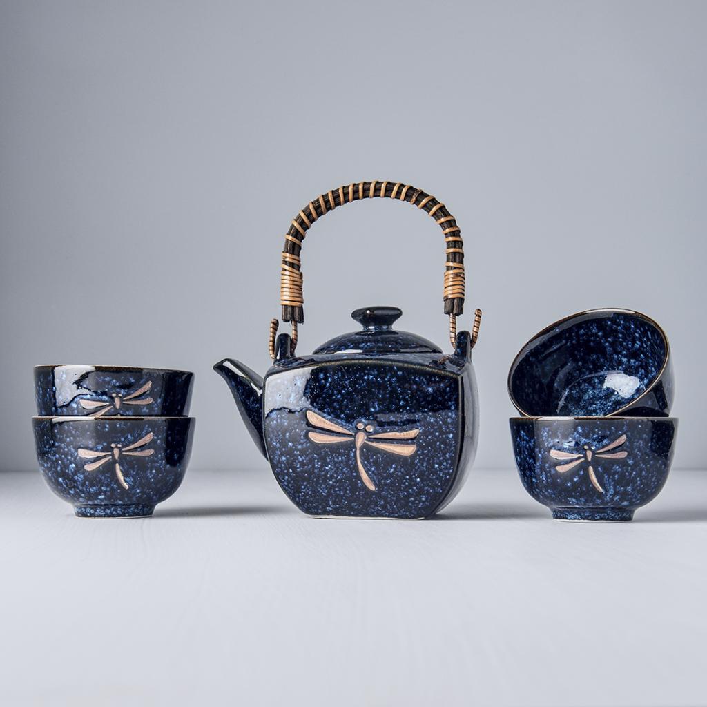 The tea set includes 1 tea pot with a volume of 750 ml and 4 tea bowls with a volume of 180 ml. The set has a distinctive blue colour with a brown dragonfly motif. The set comes in a black box and is therefore suitable as a gift.