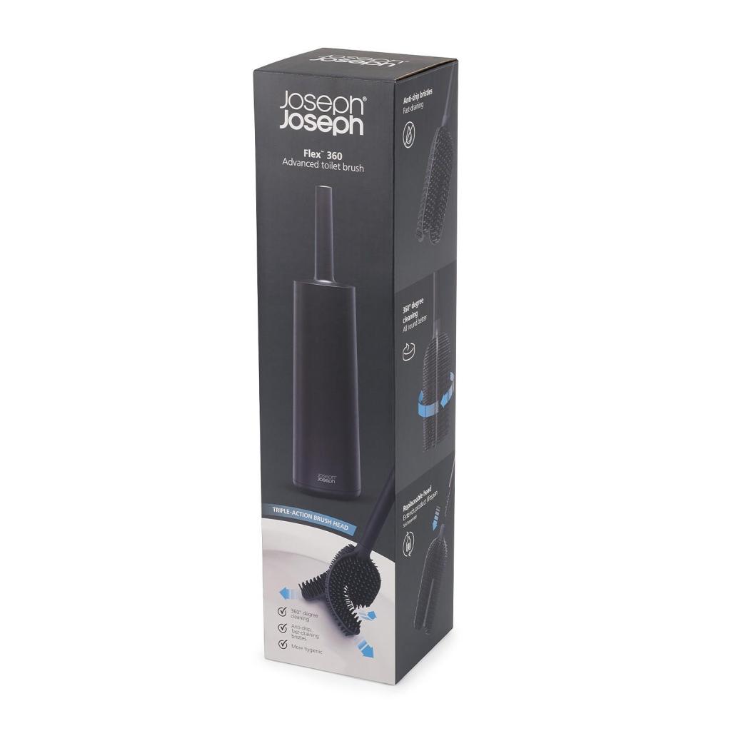 - The Joseph Joseph FLEX 360 toilet brush is designed for effective and hygienic toilet cleaning thanks to a special head that cleans in multiple directions at once.