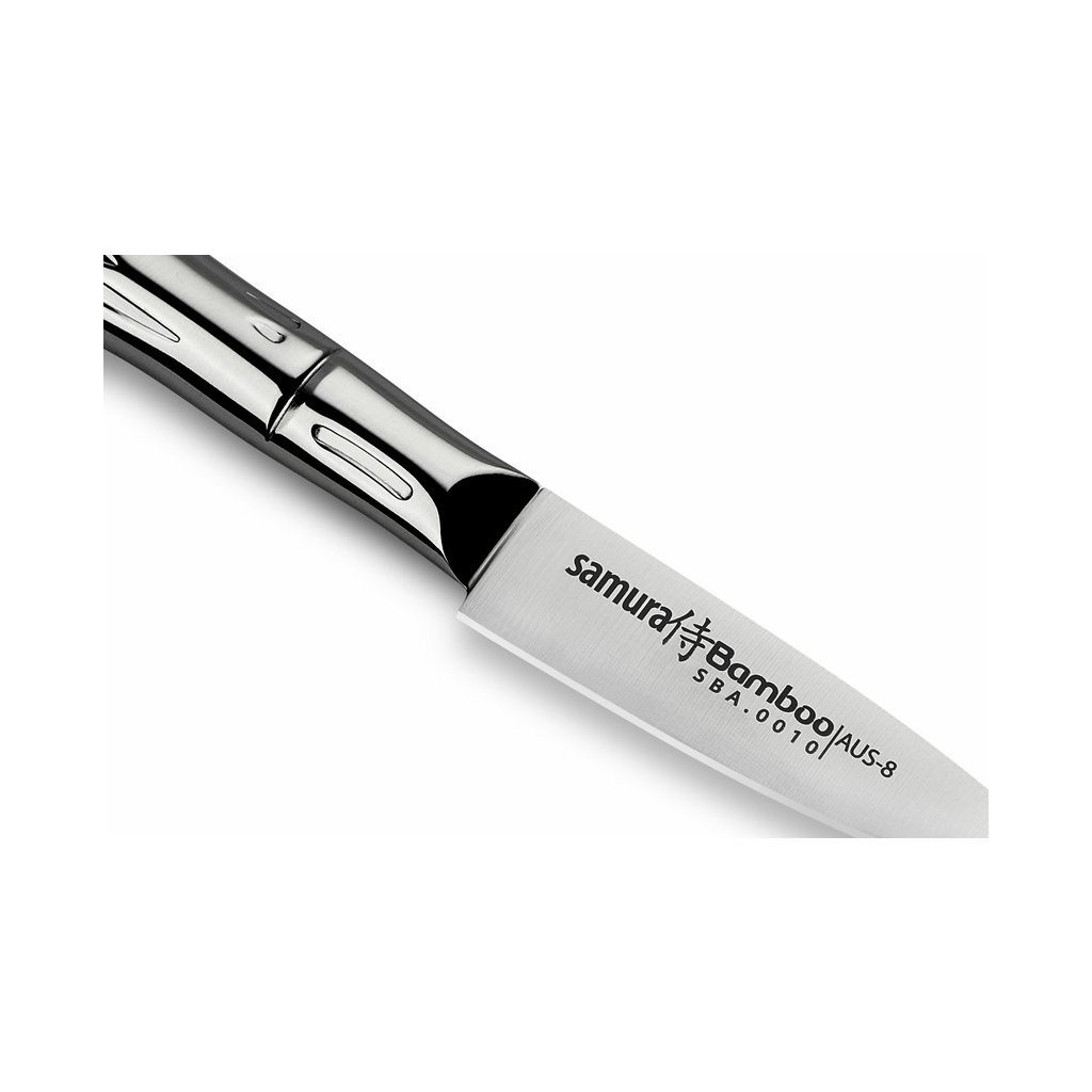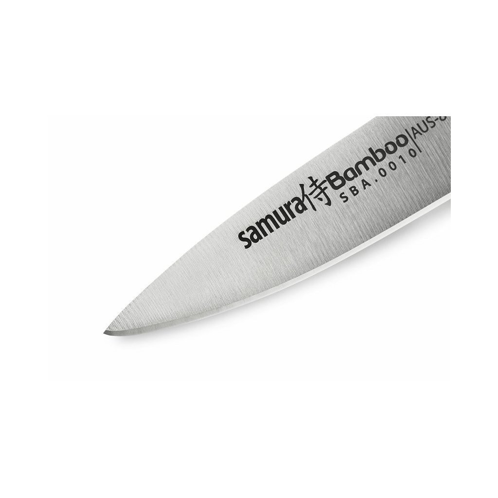 Samura knives are made from the finest Japanese and Swedish steel, hardened to 58 - 61 HRC. The blades have a Japanese shape and a gentle taper from the tip, which gives them fantastic cutting performance. Samura knives are sharpened at an angle of 17 degrees. This is more than Japanese knives, but less than European knives. The best modern materials are used for the handles: Micarta, G10, stabilized wood, plastic with a fine finish, Kraton and composites.
