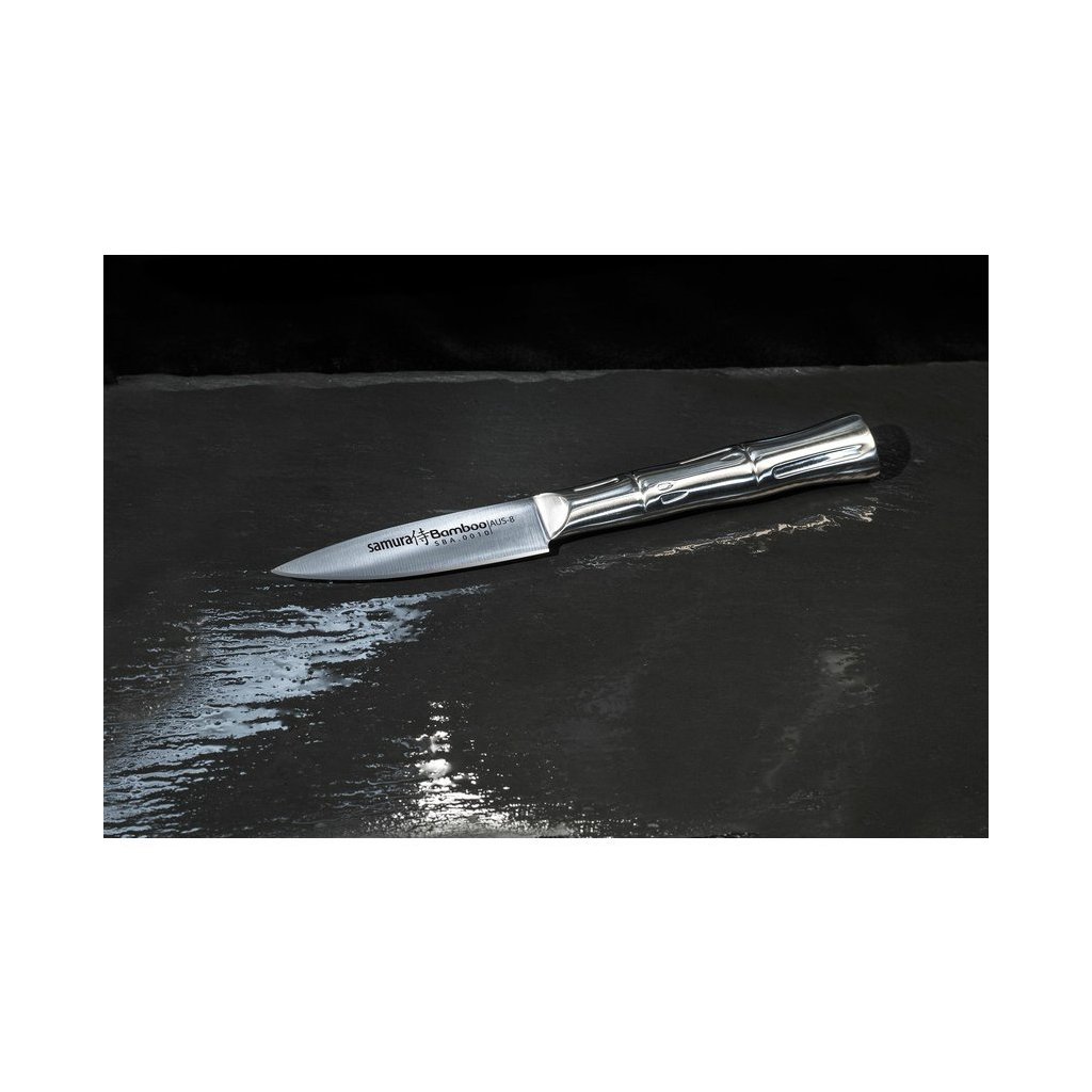 This kitchen knife is made of Japanese AUS-8 single-ply steel and is perfect for processing small vegetables and fruits. Easily remove the skin, core or cut the fruit. Thanks to its excellent hygienic properties, it can be used both in the home and in public catering and accommodation establishments. Its metal handle is not only extremely reliable and does not cling to any bacteria.